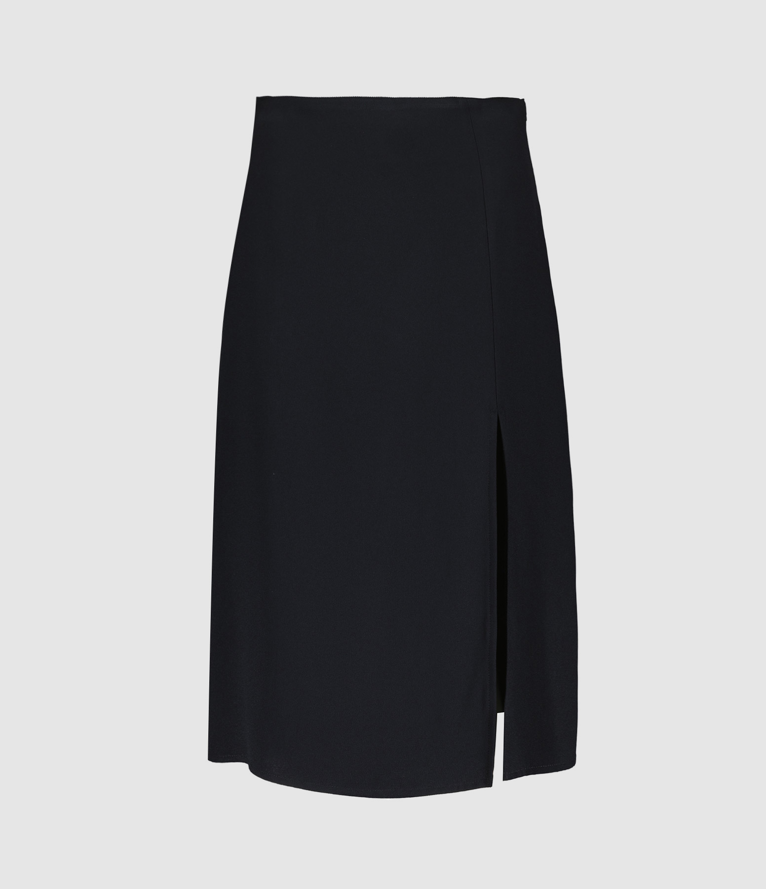 Jupe mi-longue noire fendue à gauche. Coupe évasée. Fermeture zippée invisible côté gauche.