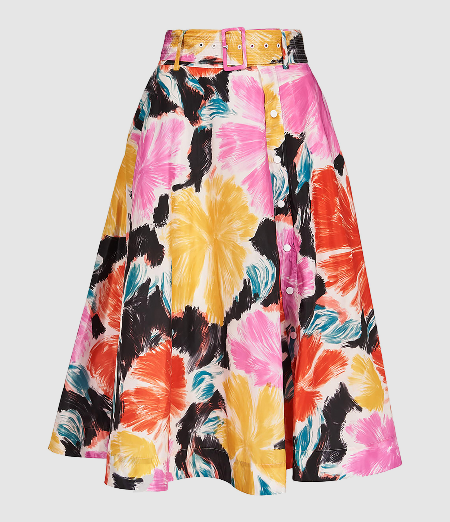Jupe mi-longue à imprimé multicolore. Ceinture ajustable à la taille. Passants pour ceinture. Taille haute. Fermeture par boutons blancs pressions sur le devant. Coupe évasée. Base droite. Doublée.