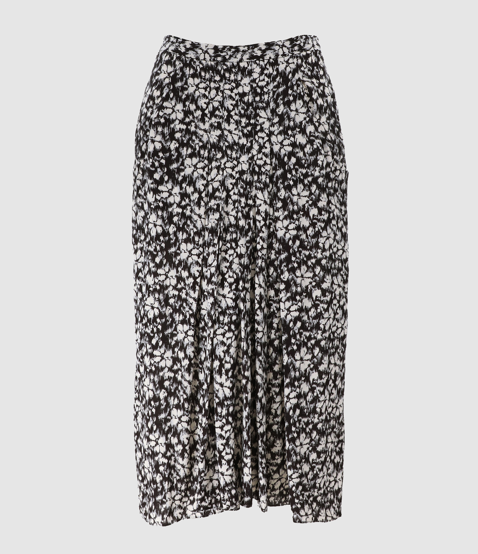 Jupe midi plissée à imprimé tacheté noir et blanc. Poches à l'avant. Zip invisible au dos. Coupe évasée. Base droite. Non doublée.