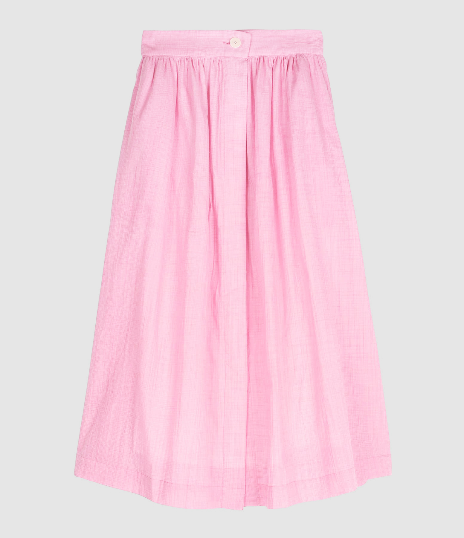 Jupe longue en coton rose. Taille haute. Boutons au centre. Deux poches italiennes. Coupe ample et évasée. Non doublée.