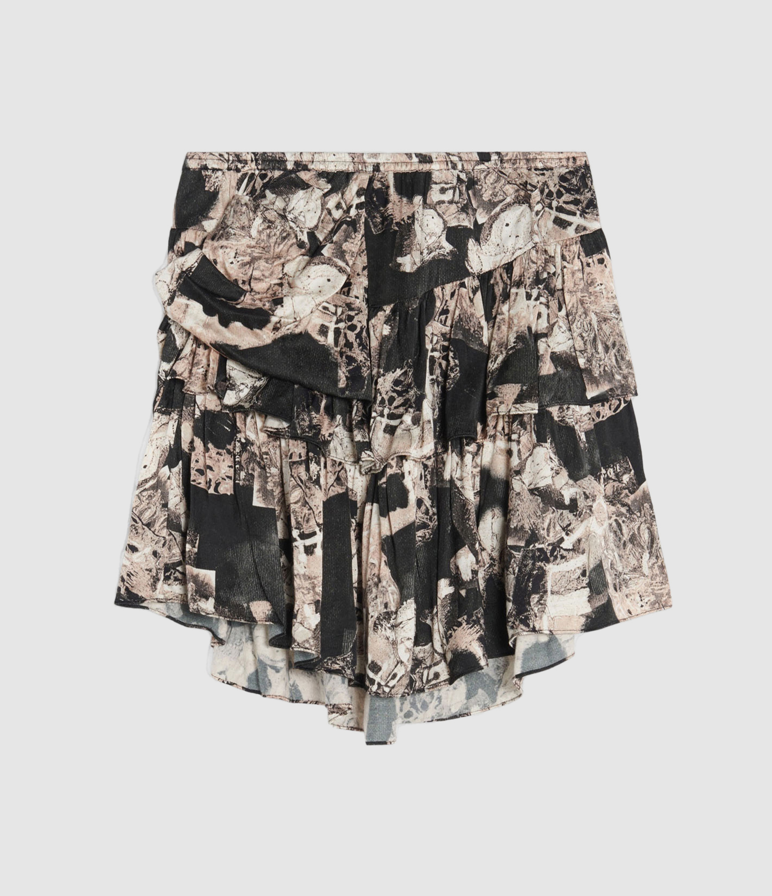 Jupe courte à volants imprimée noir beige. Taille haute élastiquée. Coupe asymétrique. Base asymétrique.