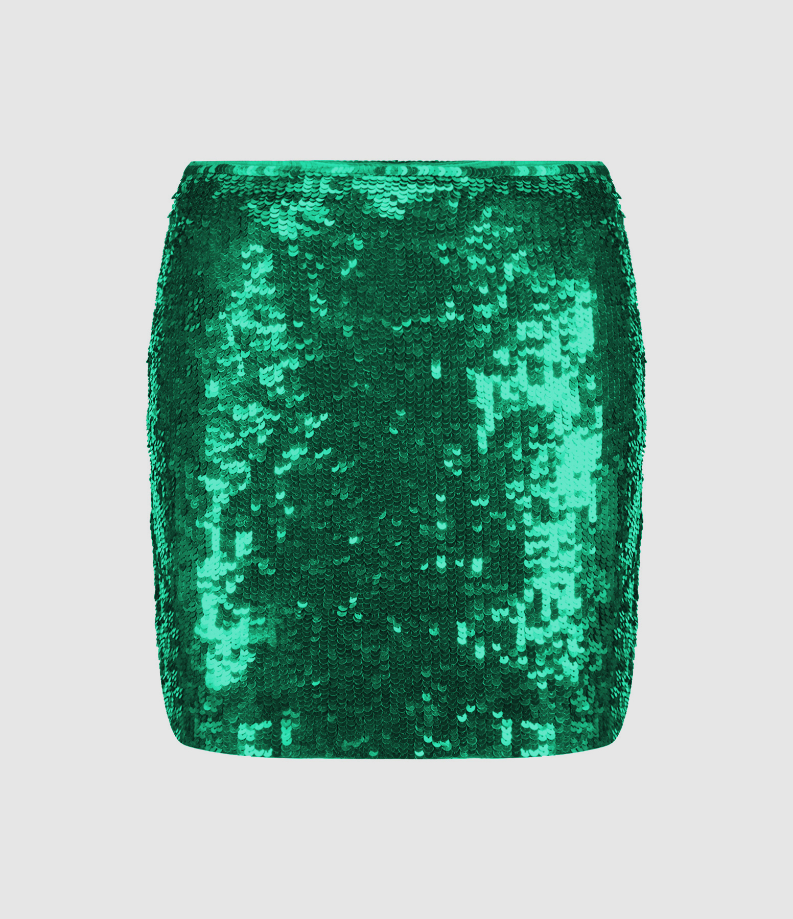 Jupe courte à sequins verts. Fermeture par zip latéral. Coupe droite. Base droite. Doublée.