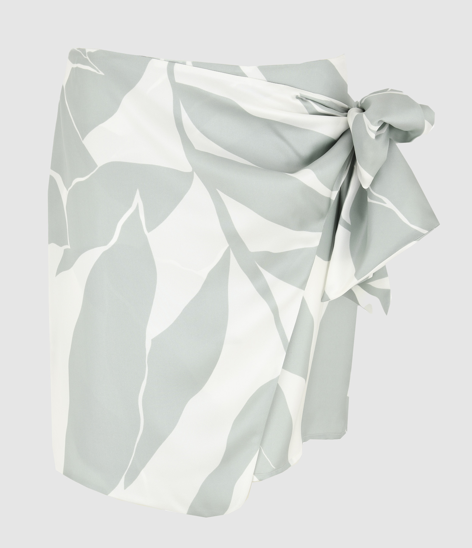 Jupe courte en sergé de pure soie imprimée, avec construction effet faux portefeuille et liens à nouer sur le côté.