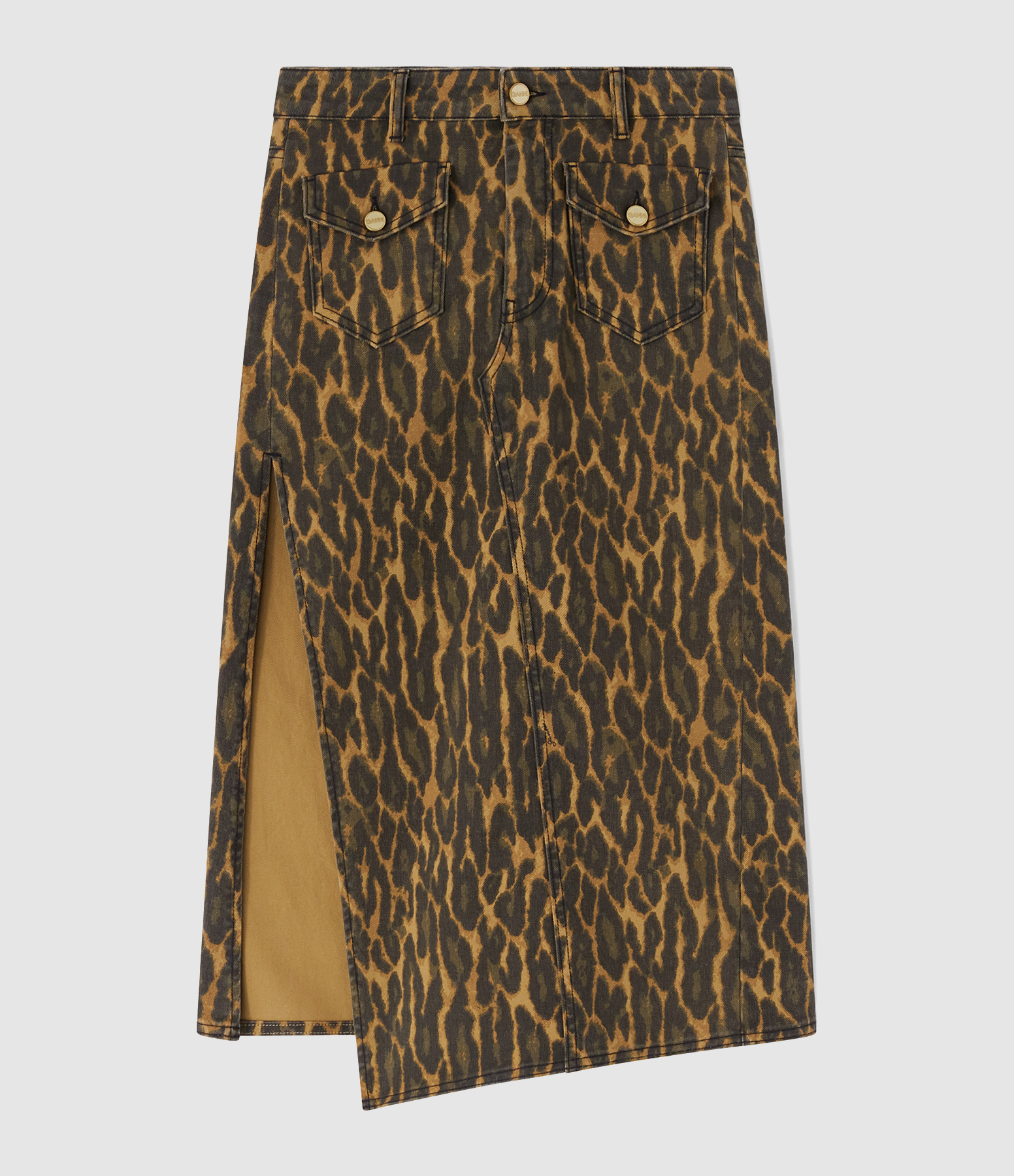 Jupe mi-longue léopard en denim. Fente sur le côté droit. 2 poches à fermeture par bouton unique sur l'avant et passants pour ceinture.