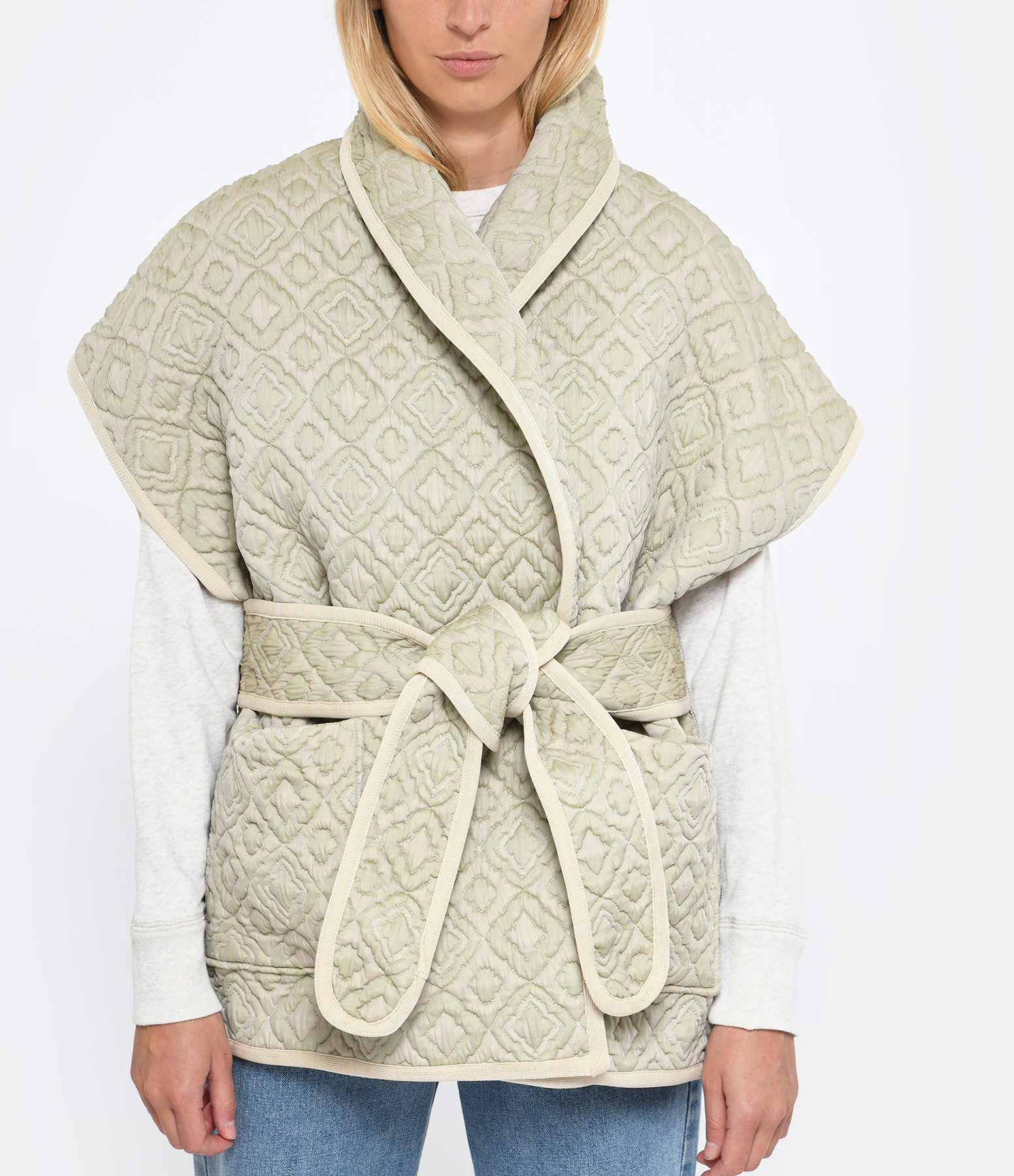 Kimono manches courtes matelassé vert. Deux poches plaquées sur le devant. Ceinture assortie à nouer à la taille. Coupe large. Base droite.