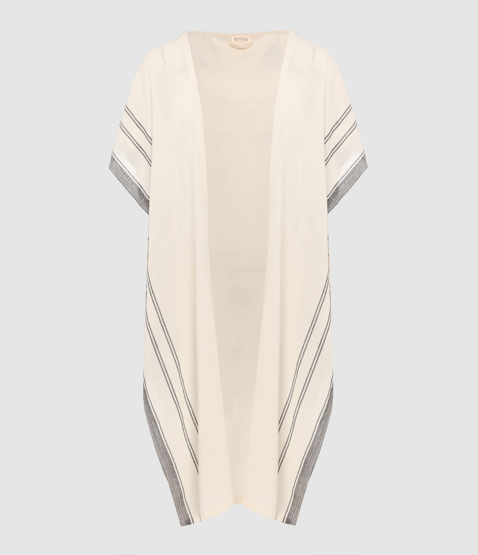 Kimono beige à rayures grises au niveau des manches. Manches chauves-souris. Fentes latérales au bas. Coupe droite. Base droite.
