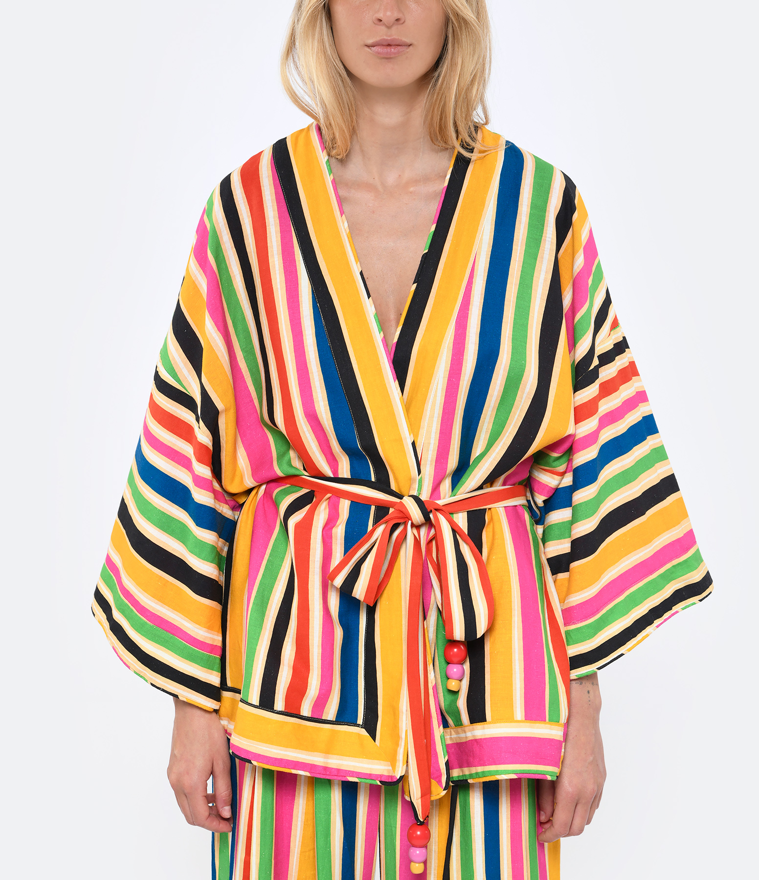 Kimono à rayures multicolores. Manches trois-quarts. Ceinture à nouer à la taille. Coupe droite. Base droite.