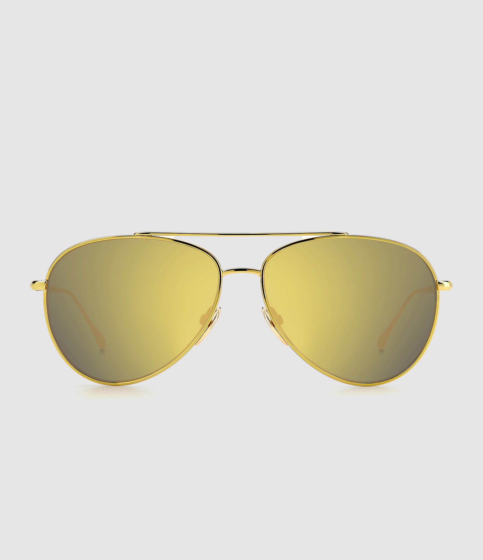 Lunettes de soleil style aviateur. Montures dorés. Verres dégradés jaunes.