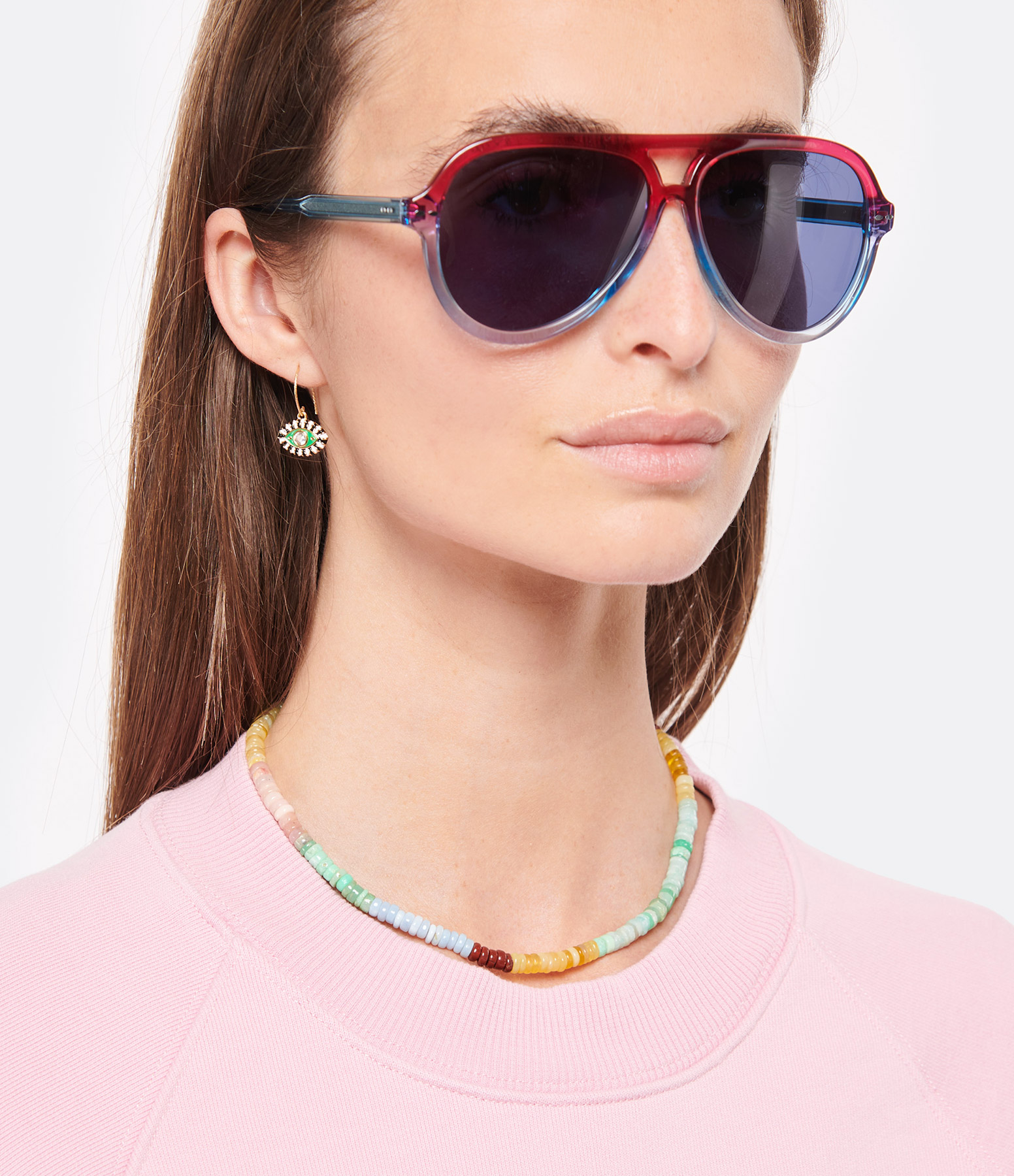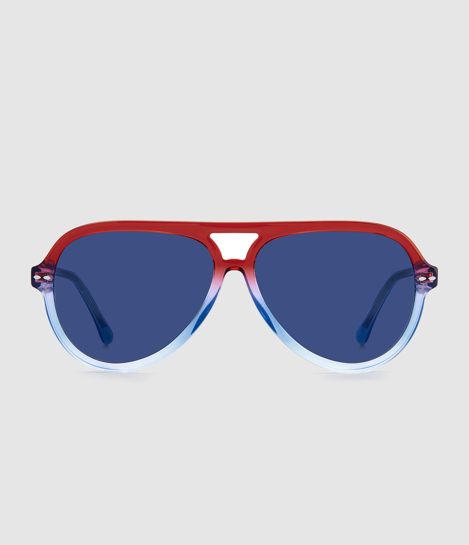 Lunettes de soleil style aviateur. Monture bicolore rouge et bleue Verres dégradés bleus.
