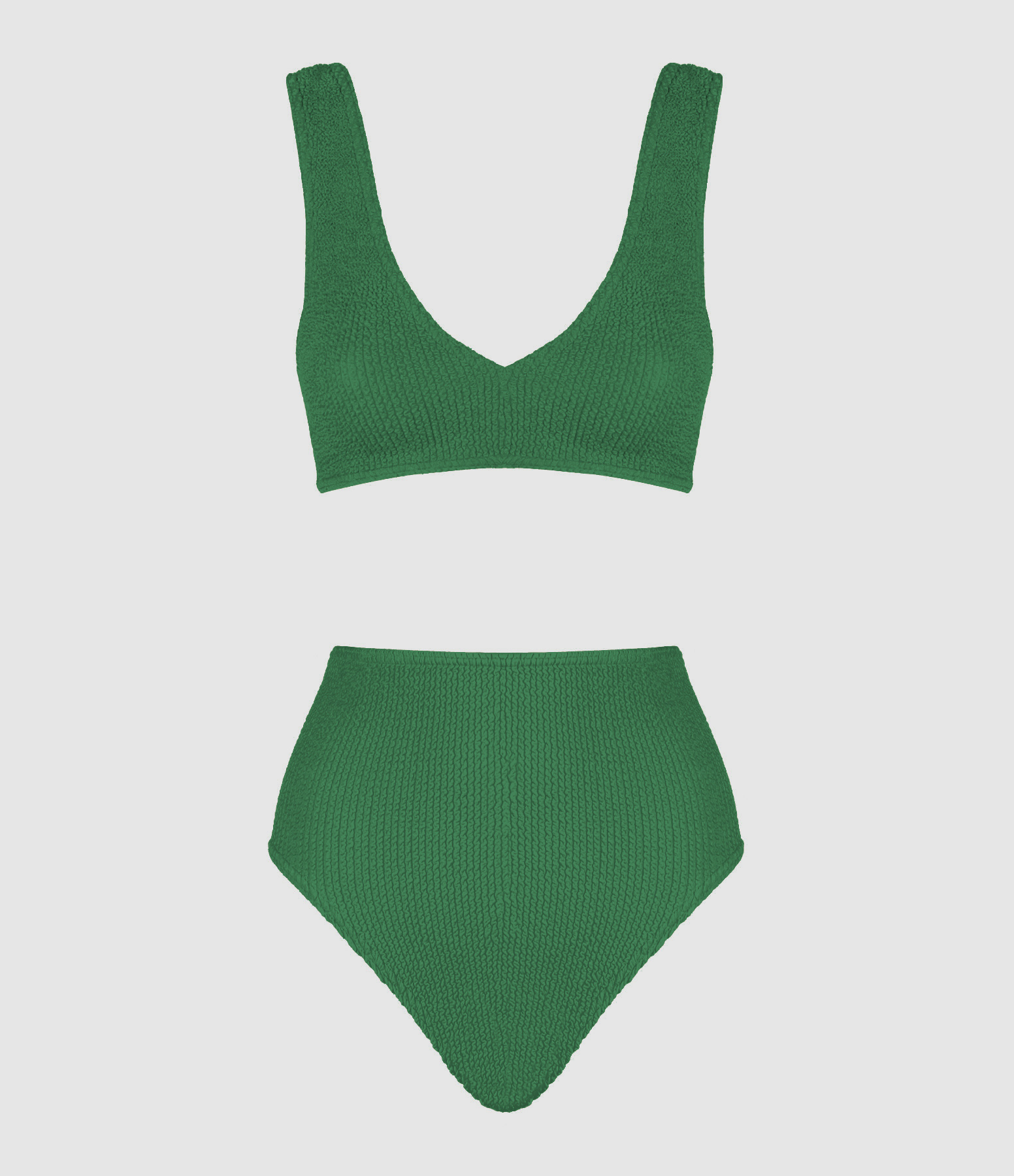 Maillot de bain deux pièces en tissu extensible et côtelé vert. Brassière avec deux bretelles larges et décolleté en V. Culotte taille haute. Doublé.