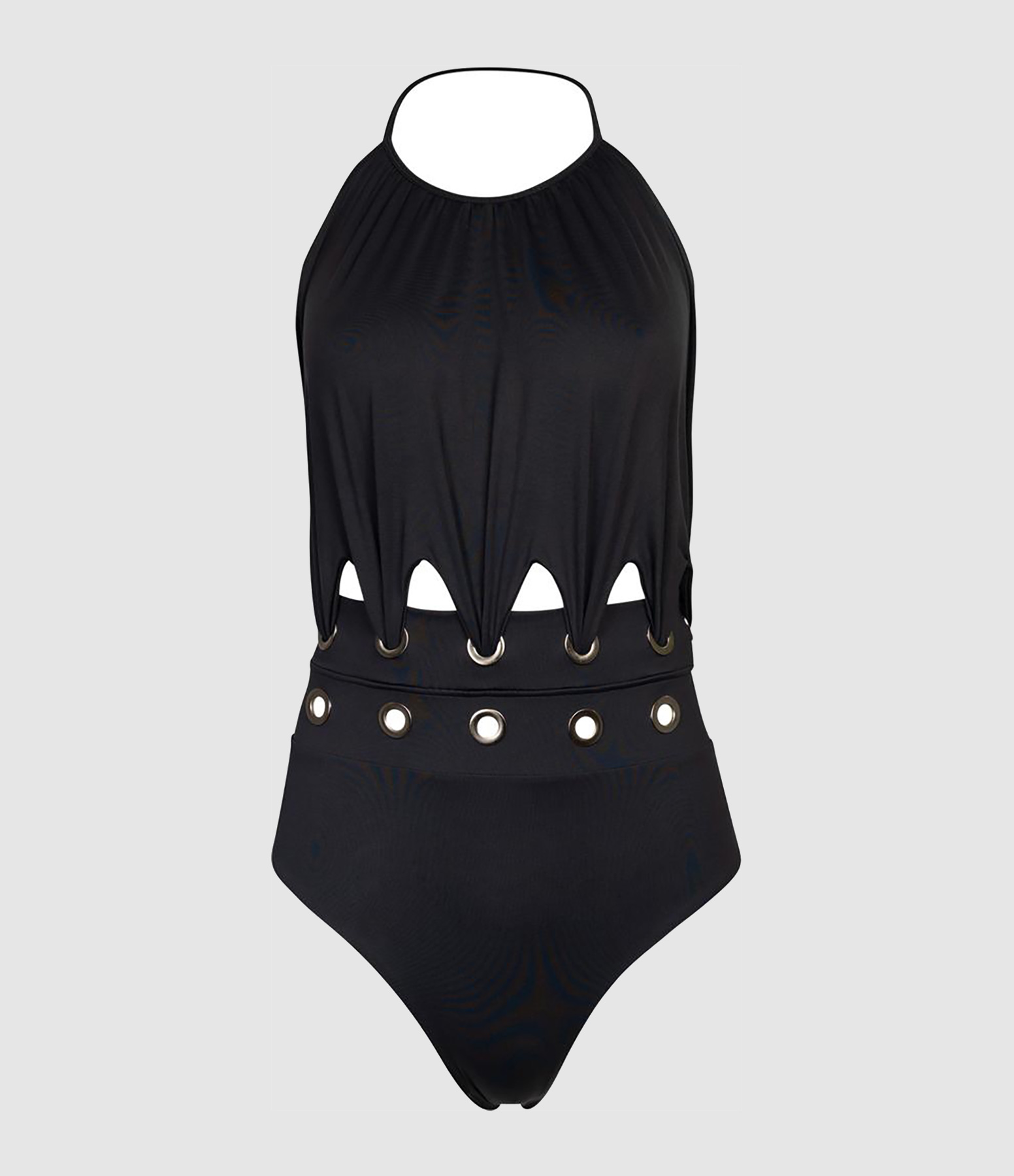 Maillot de bain une pièce noir. Œillets en métal au niveau de la taille. Dos nu.