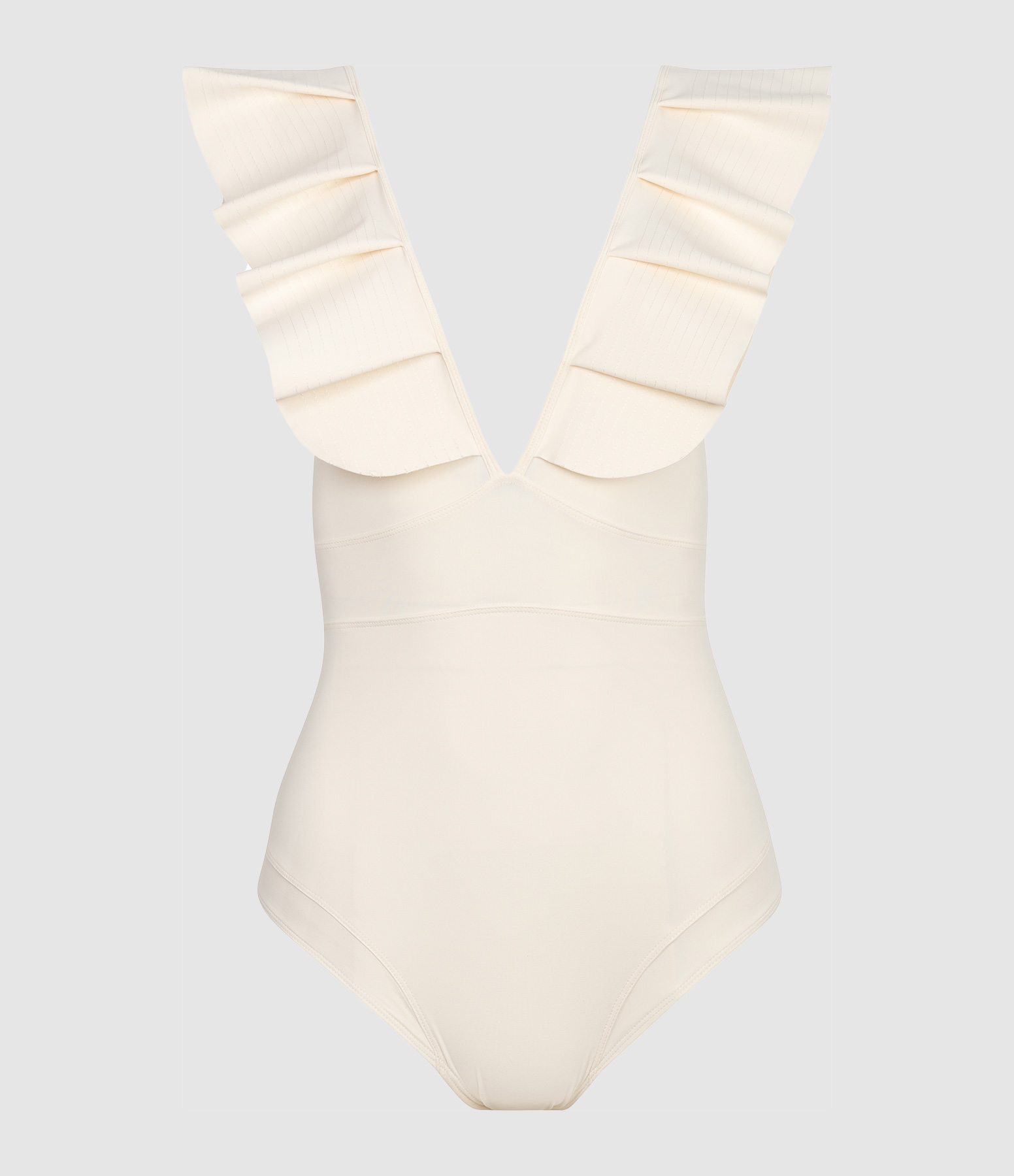 Maillot de bain une pièce en tissu extensible crème. Découpe à l'avant au niveau du décolleté et décolleté dans le dos. Bretelles volantées. Doublé.