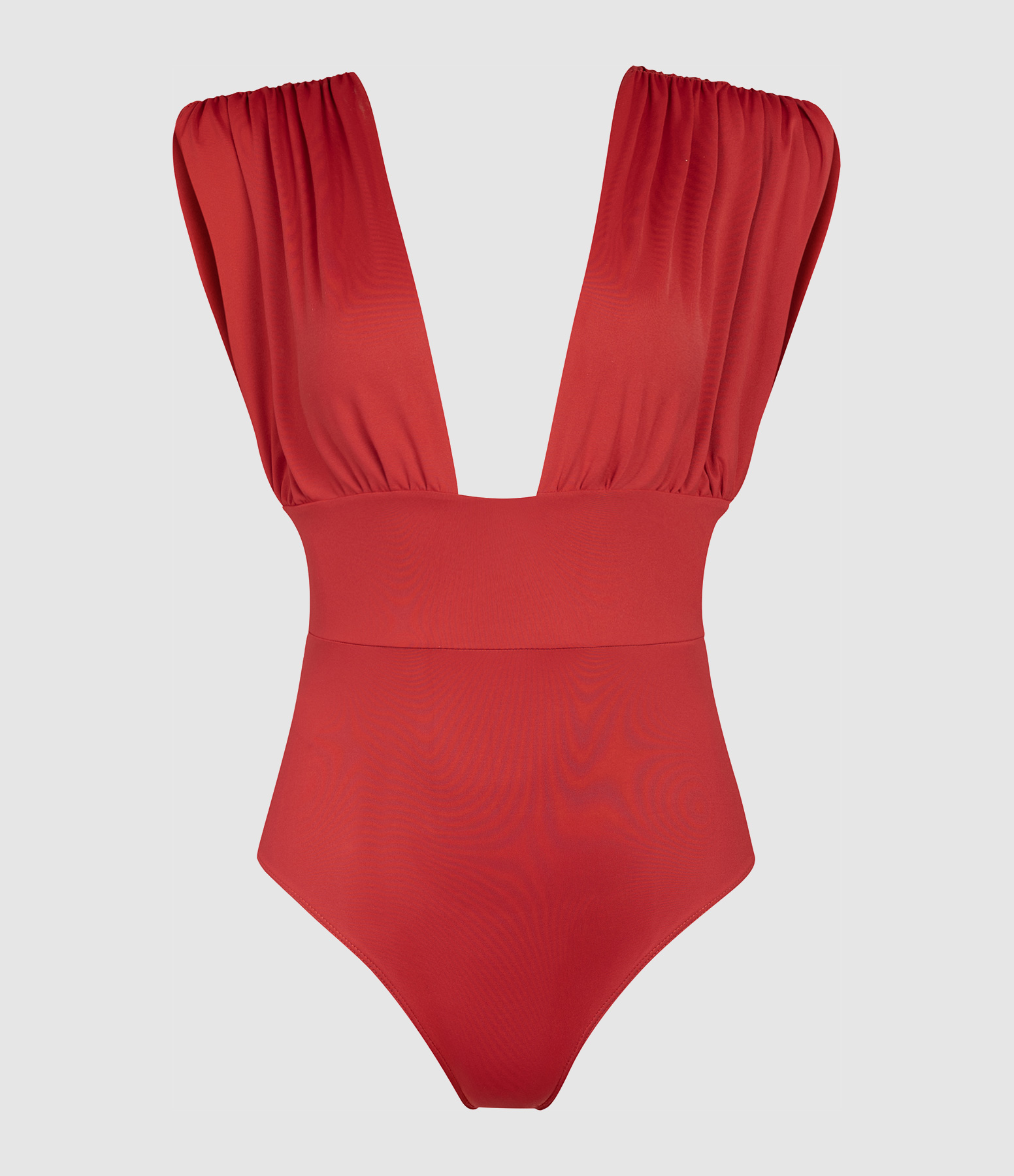 Maillot de bain une pièce rouge. Dos échancré. Drapé raffiné au niveau des épaules et de la poitrine. Décolleté en V échancré.