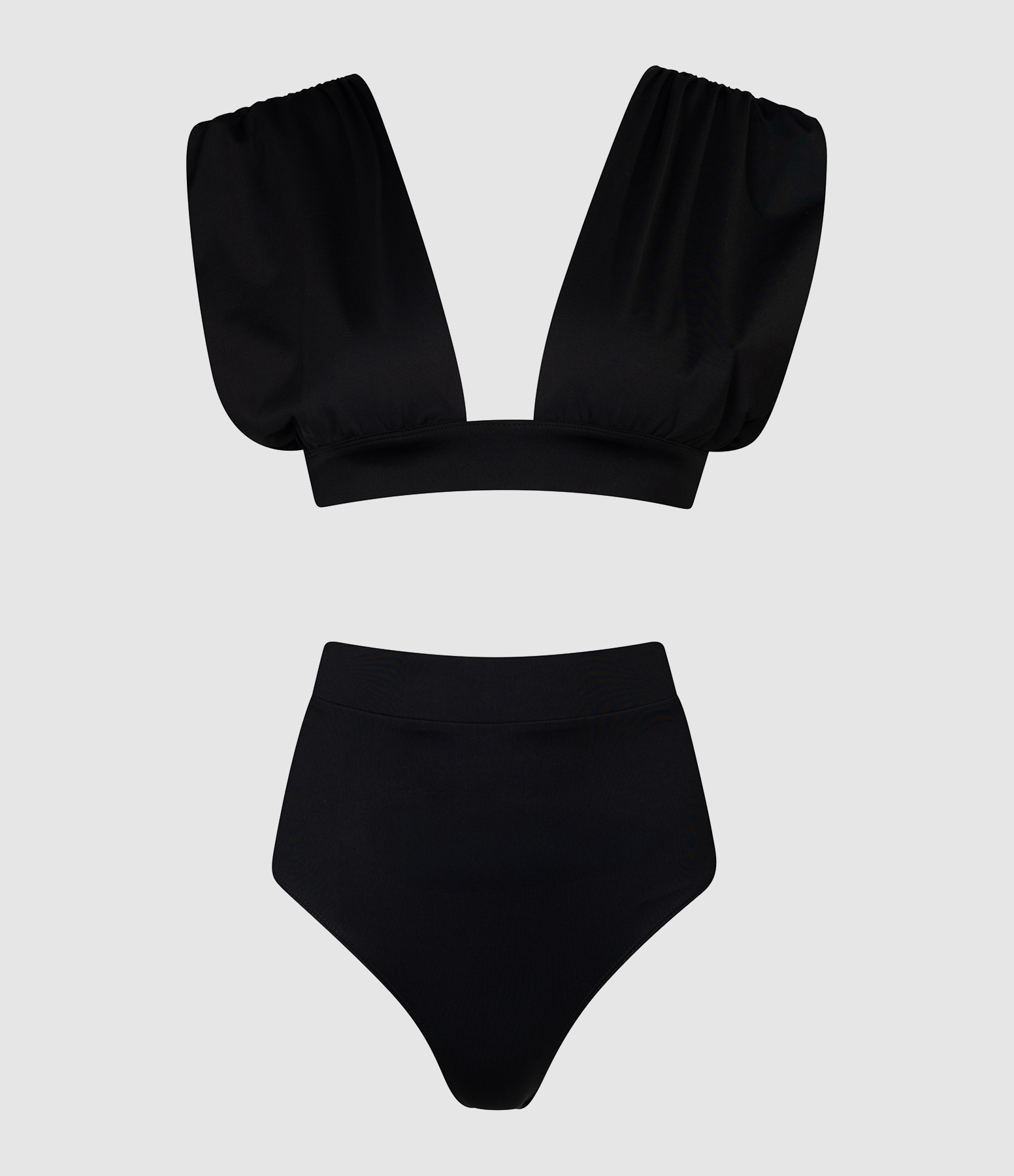 Maillot de bain deux pièces noir. Décolleté en V échancré. Fronces au niveau des épaules. Dos échancré. Culotte taille haute.