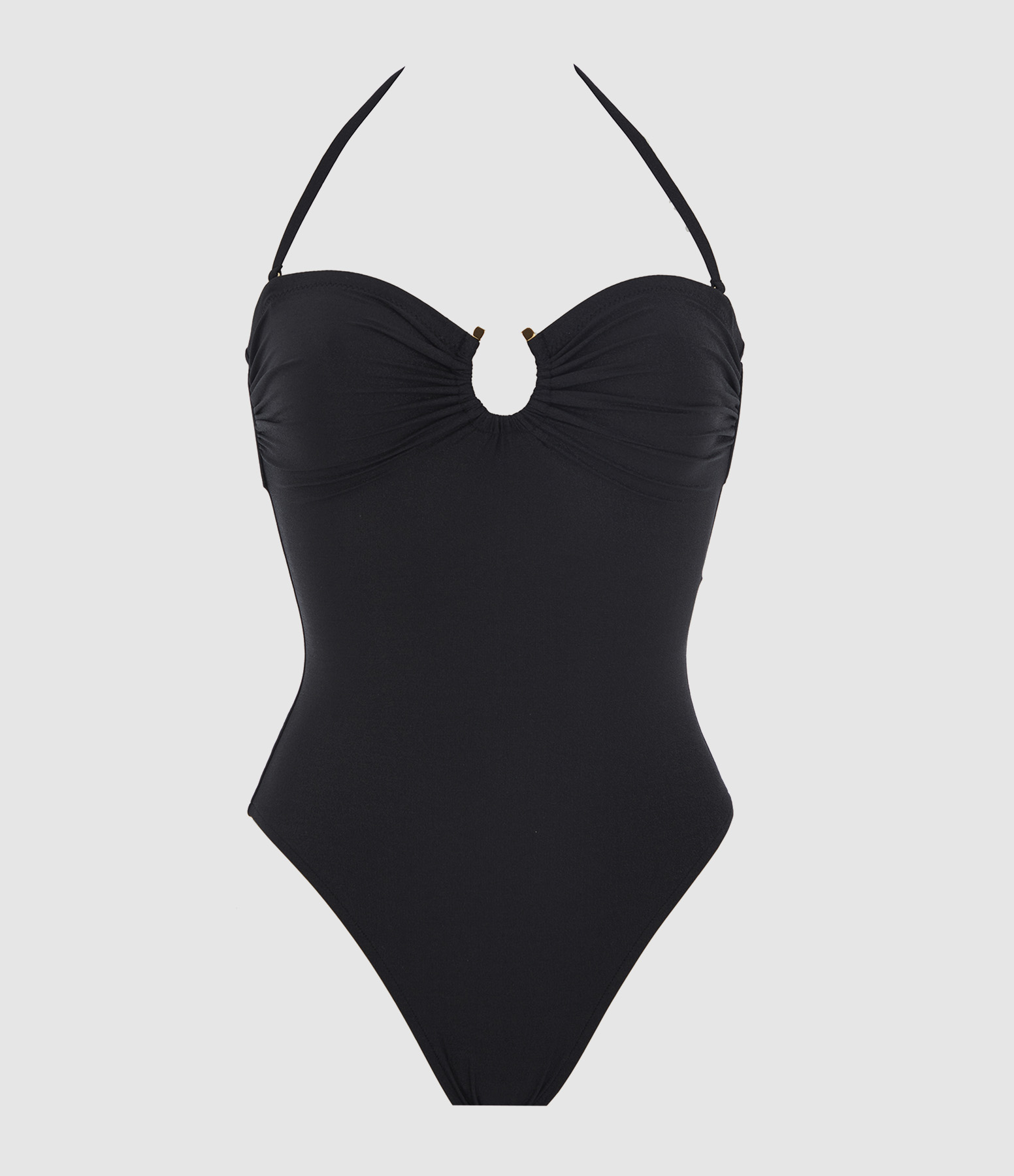 Maillot de bain une pièce noir à paillettes dorées, design bustier avec bretelles amovibles et bijou doré à l’avant.