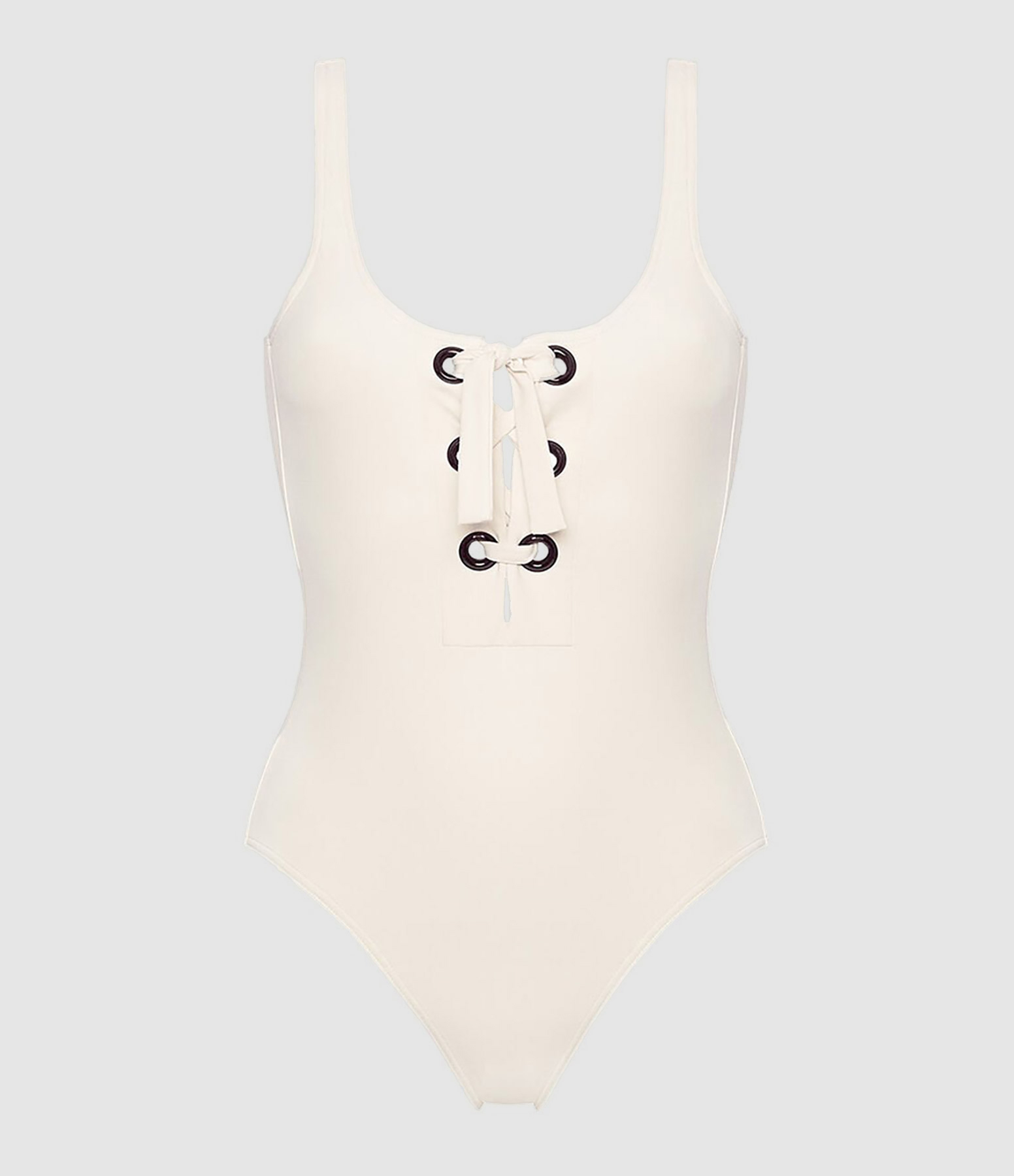 Maillot de bain une pièce écru. Décolleté avec six œillets fermés par un lien à nouer à l'avant. Larges bretelles. Dos nageur Non doublé.
