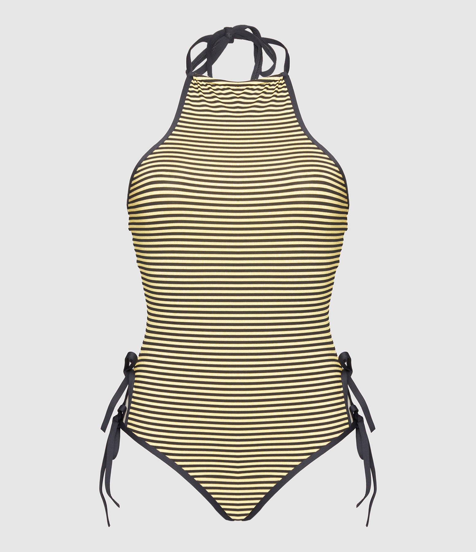 Maillot de bain une pièce à rayures dorées et noires. Dos nus. Fermeture par cordons à nouer dans la nuque. 4 cordons à nouer à la taille.