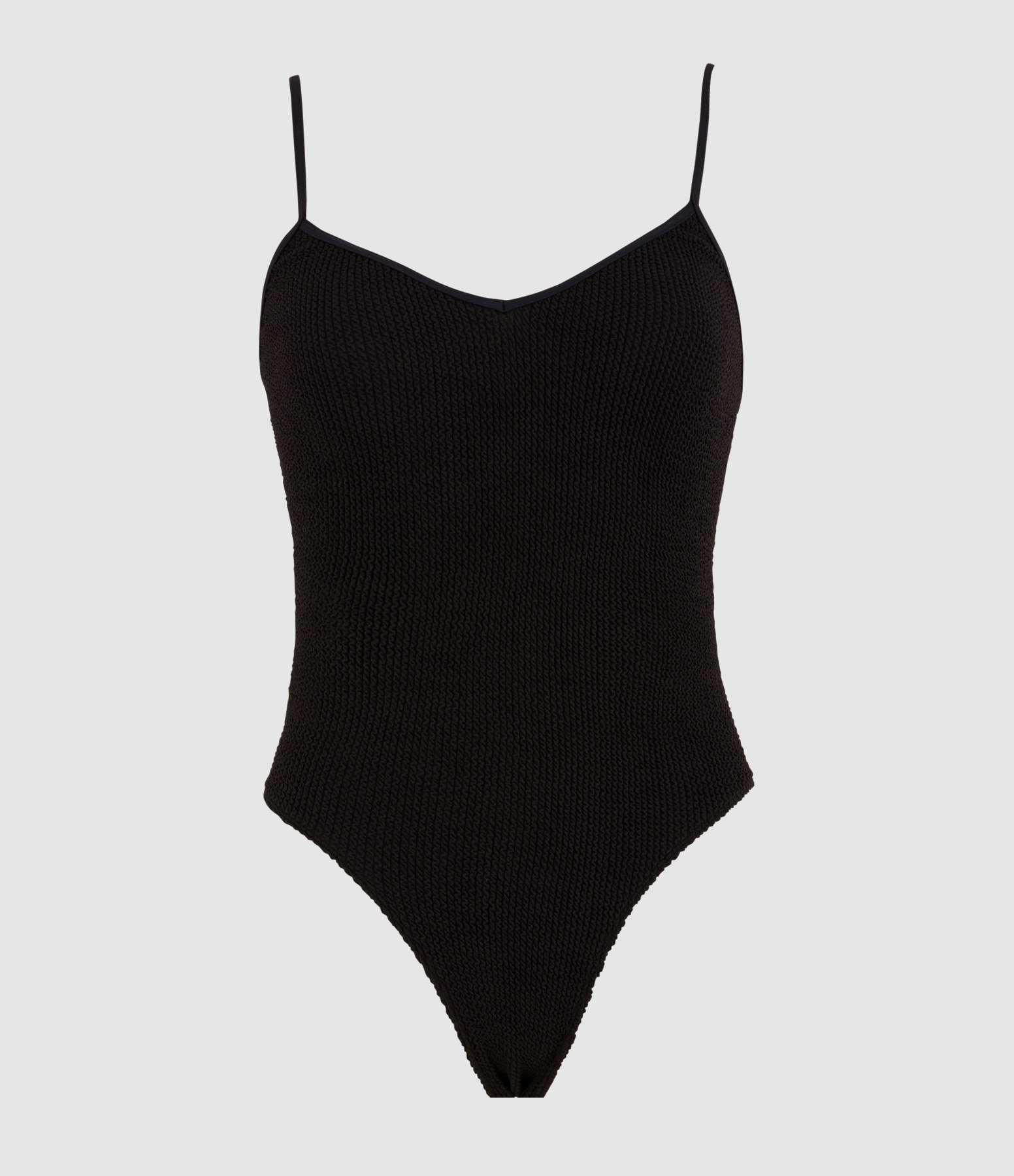Maillot de bain une pièce en tissu extensible et côtelé noir. Décolleté en V à l'avant et dos ouvert avec deux bretelles réglables. Coupe échancré. Doublé.