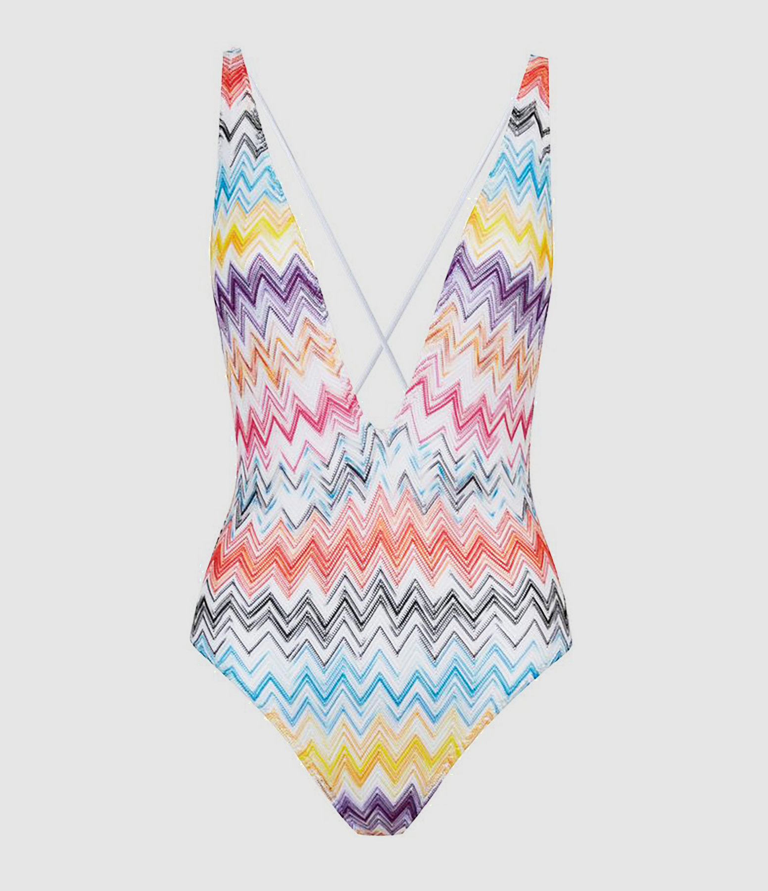 Maillot une pièce multicolore. Décolleté plongeant. Bretelles croisées dans le dos. Doublé.