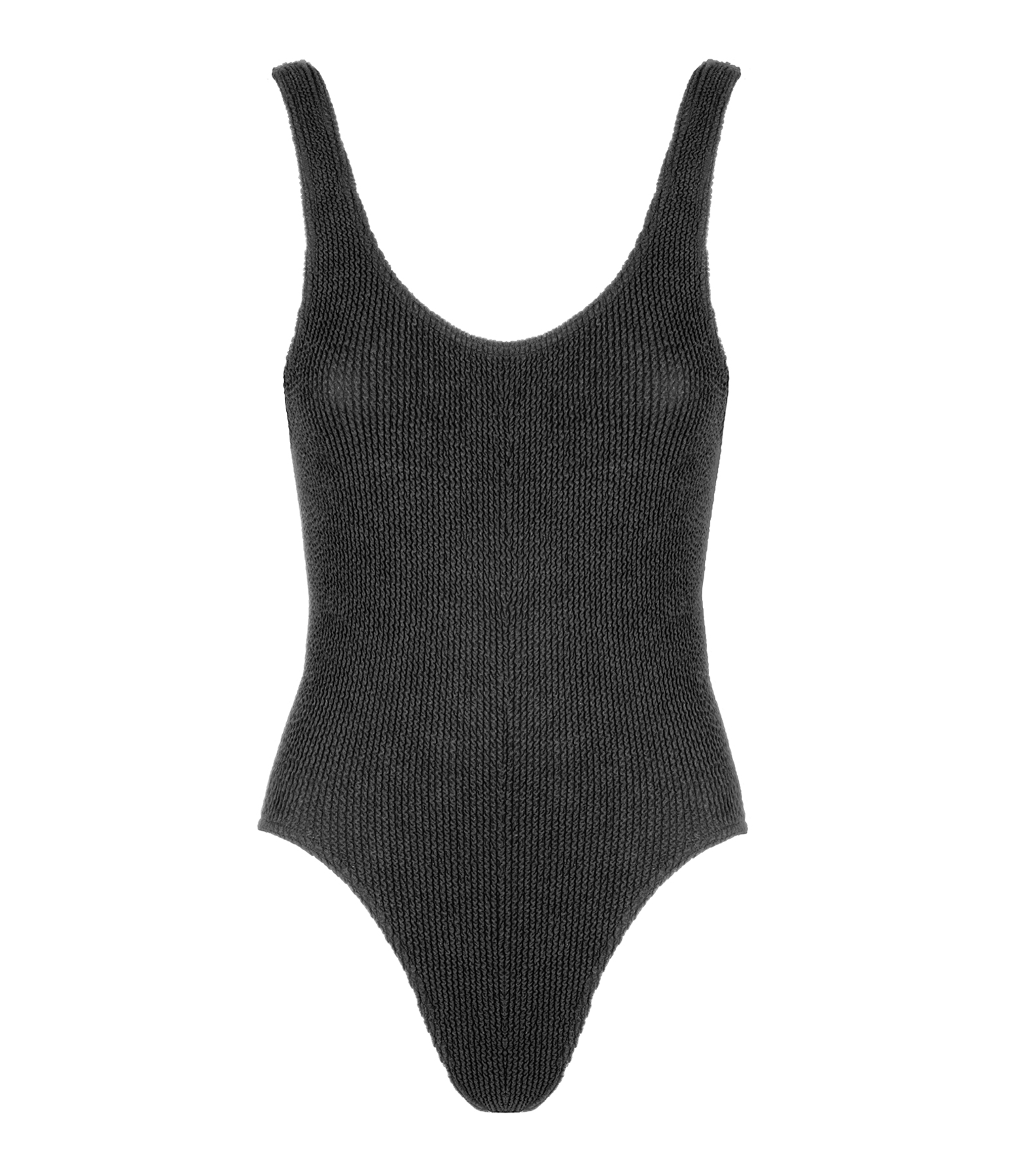 Maillot de bain une pièce en tissu extensible et côtelé noir. Col rond à l'avant et décolleté dans le dos. Doublé.