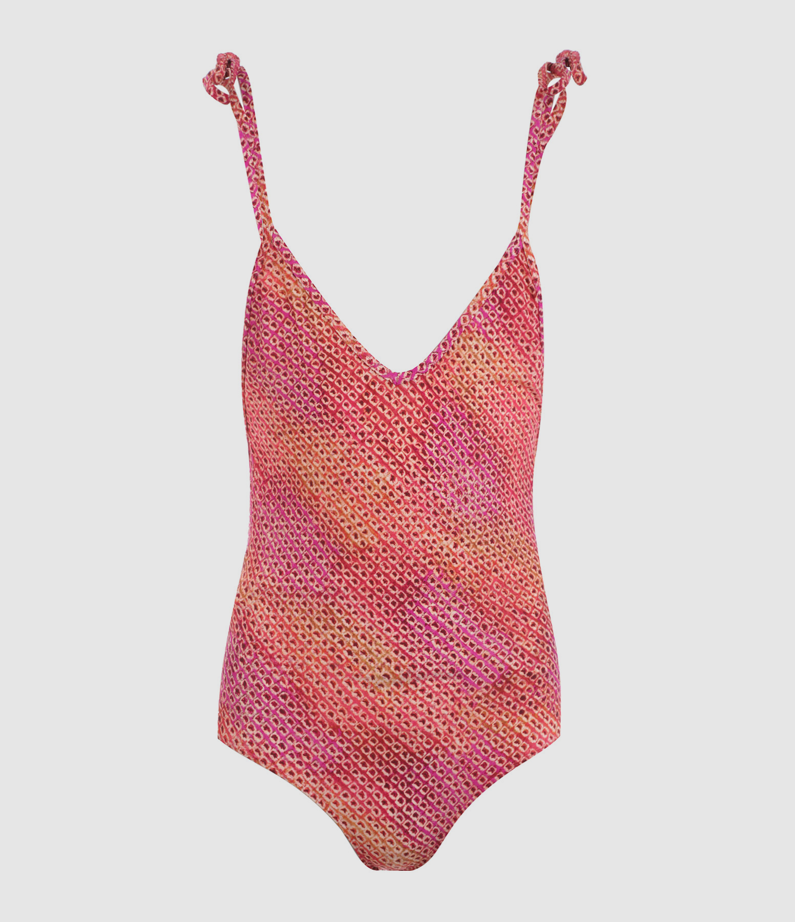 Maillot de bain une pièce à imprimé abstrait orange et rose. Bretelles dans le dos à nouer aux épaules. Échancré dans le dos. Non doublé.