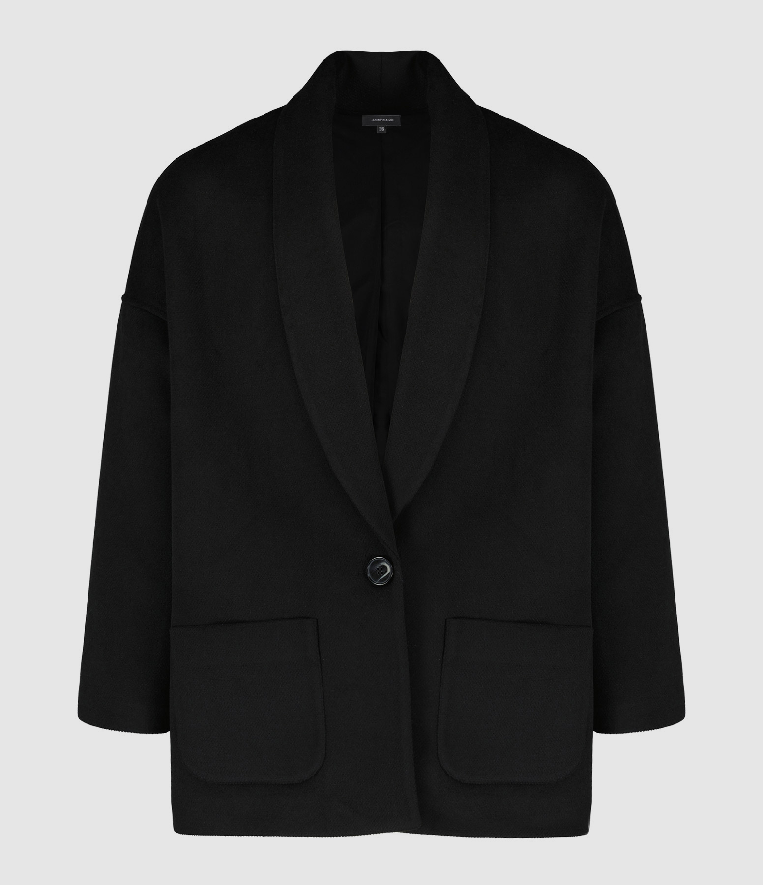 Manteau court noir. Col châle. Manches longues. Fermeture boutonnée simple sur le devant. Bouton effet corne noir. Deux poches plaquées sur le devant. Coupe ample. Base droite. Doublé