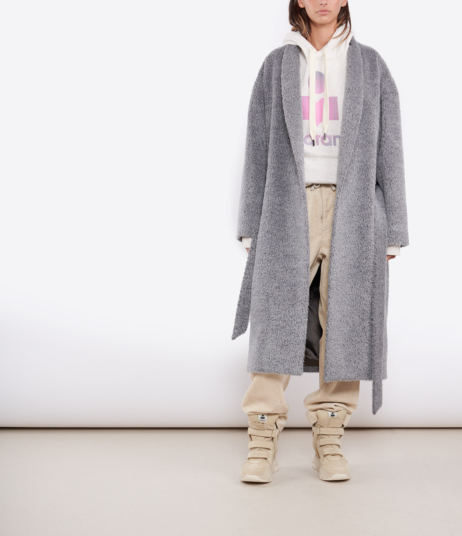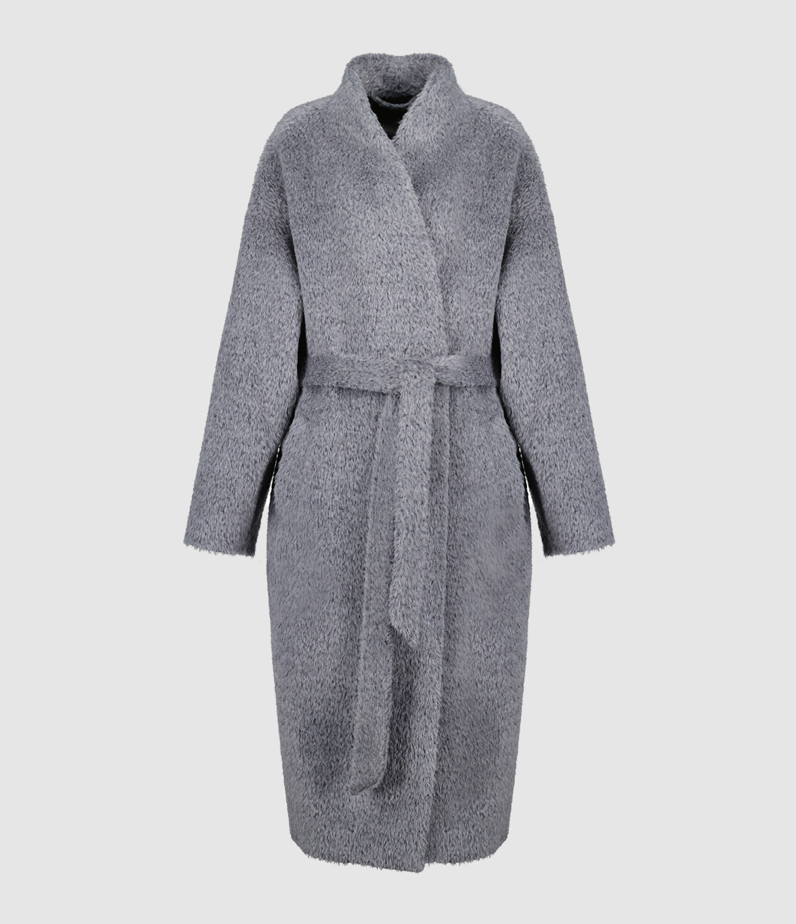 Manteau long effet fourrure gris. Col légèrement montant. Manches longues. Fermeture par une ceinture assortie. Deux poches italiennes et une poche à l'intérieur. Coupe large. Base droite. Doublé.