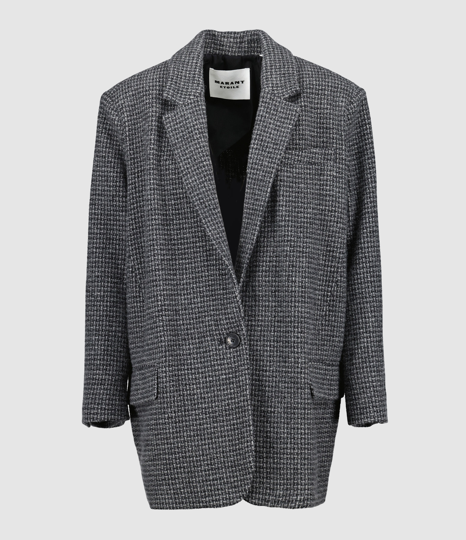 Manteau en laine à motif pied de poule gris. Manches longues. Col tailleur. Fermeture par un bouton. Deux poches à rabats et une poche passepoilée sur la poitrine. Partiellement doublé. Coupe droite. Base droite.