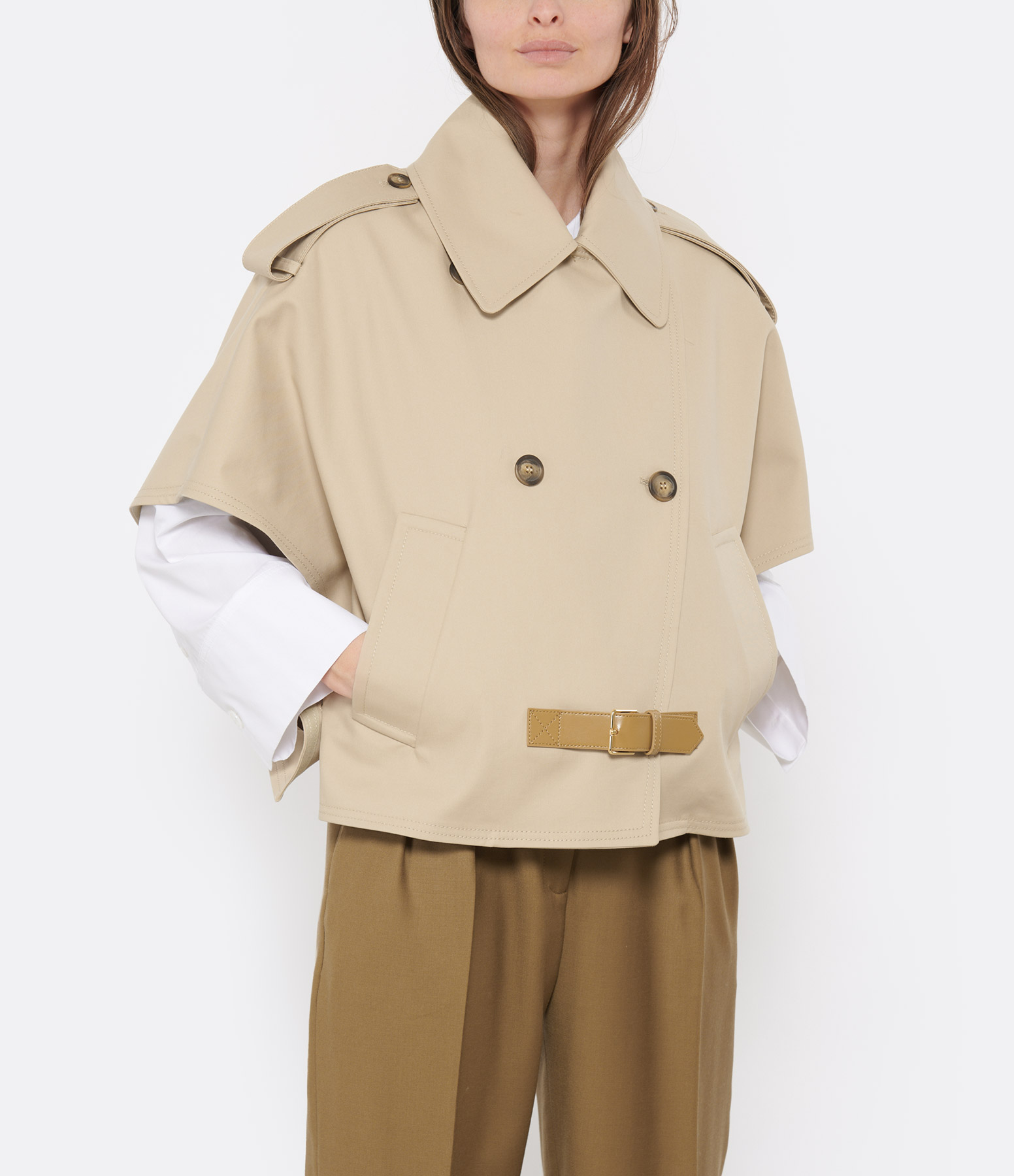 Cape courte beige. Col V. Fermeture par boutons et ceinture. 2 poches. Manches courte boutonnées. Pattes d'épaules boutonnées. Coupe ample. Base droite.