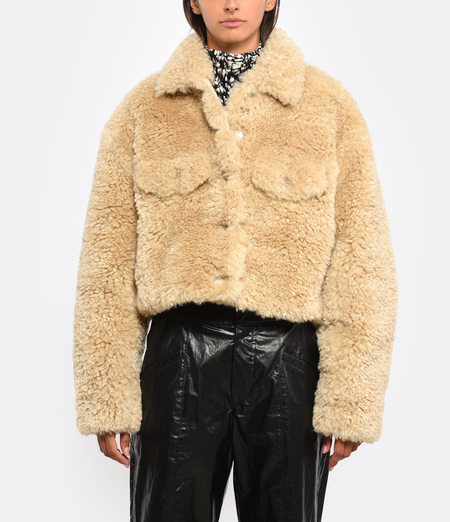 Manteau court en effet laine beige. Col chemise. Fermeture par boutons argentés à l'avant. Deux poches à rabat et deux poches italiennes. Manches longues boutonnées aux poignets. Coupe droite. Base droite.