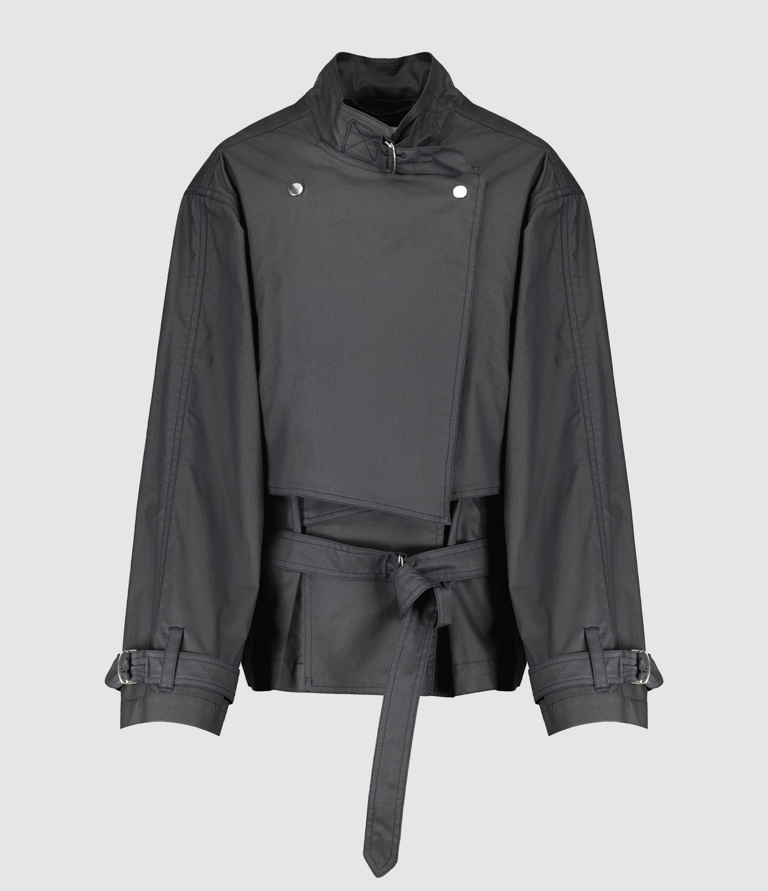 Veste courte noire effet trench. Col rond montant avec pattes de serrage avec boucle métallique. Fermeture sur le devant avec boutons métalliques. Quatre rabats sur le devant pour porter la veste de diverses manières. Manches longues avec pattes de serrage avec boucle métallique au niveau des poignets. Base avec ceinture ajustable et amovible avec boucle métallique.