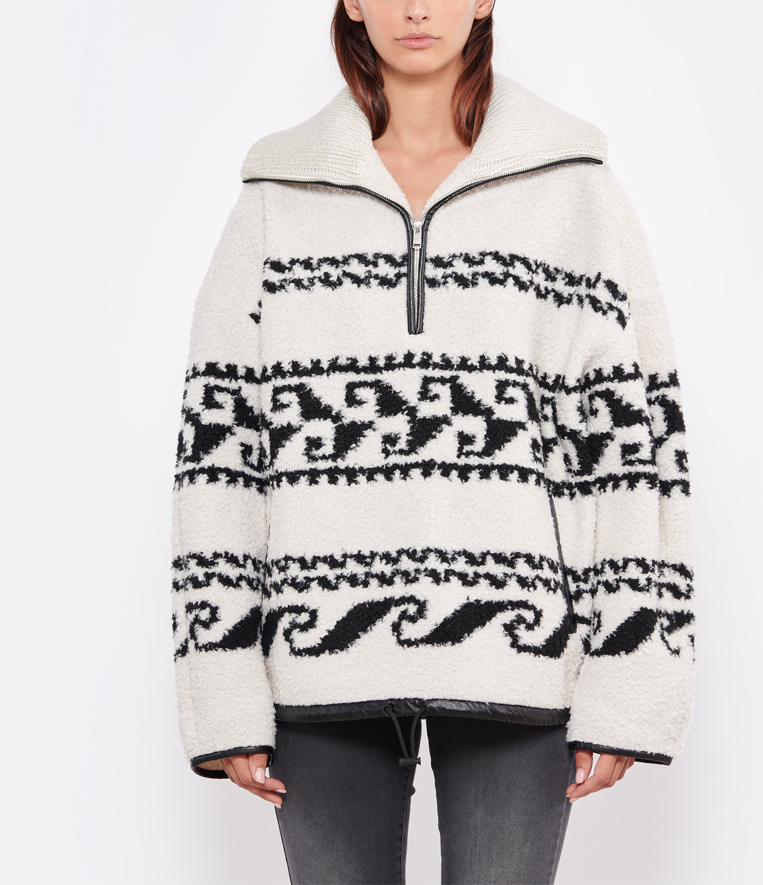Pull en polaire blanche à imprimé noir. Col montant zippé à l'avant. Deux poches italiennes sur le devant. Manches longues. Coupe droite. Base droite avec cordon de serrage.