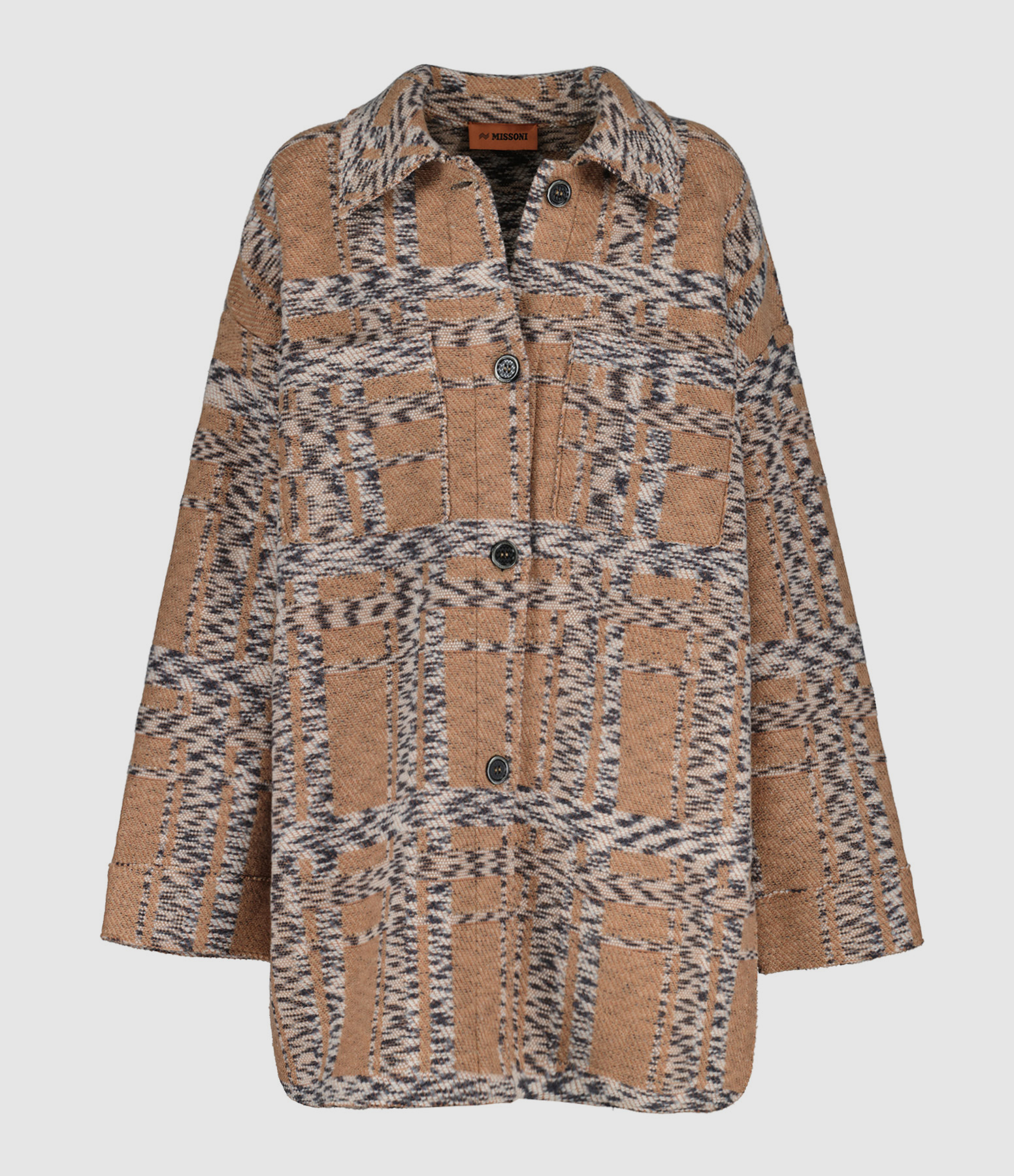 Manteau court en maille de laine marron associé à un quadrillage gris. Col chemisier. Manches longues. Fermeture boutonnée simple sur le devant. Boutons noirs. Deux poches plaquées poitrine. Fentes latérales. Coupe ample. Base arrondie.