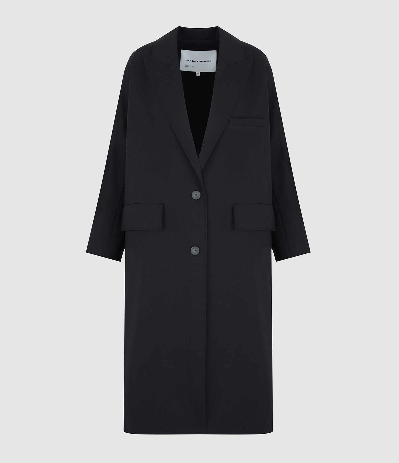Manteau long noir. Col tailleur. Manches longues. Deux poches plaquées à rabat. Une poche passepoilée. Fermeture par boutons. Coupe ample. Base droite.