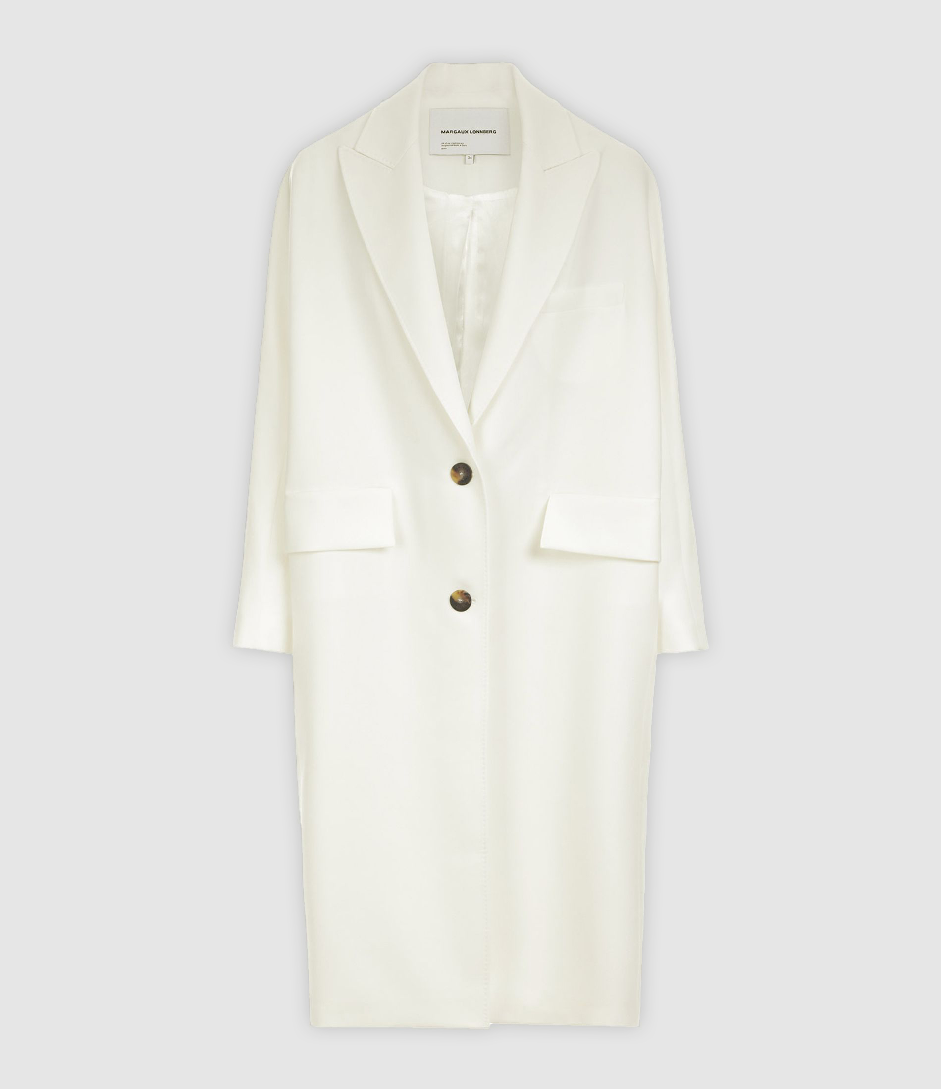 Manteau long écru. Col tailleur. Manches longues. Deux poches plaquées à rabat. Une poche passepoilée. Fermeture par boutons. Coupe ample. Base droite.