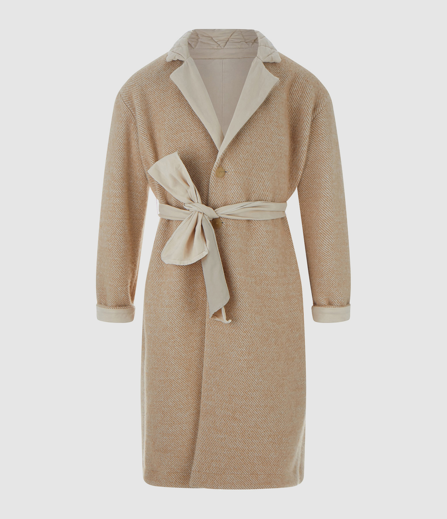 Manteau long réversible en coton beige. Col en V à revers. Manches longues. Fermeture par boutons et ceinture amovible. Deux poches plaquées d'un côté. Coupe droite. Base droite.