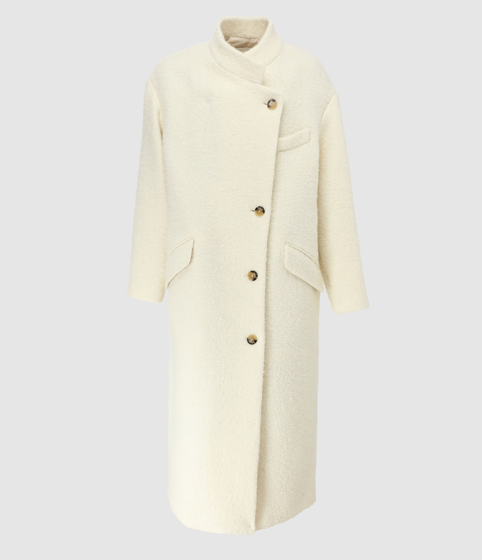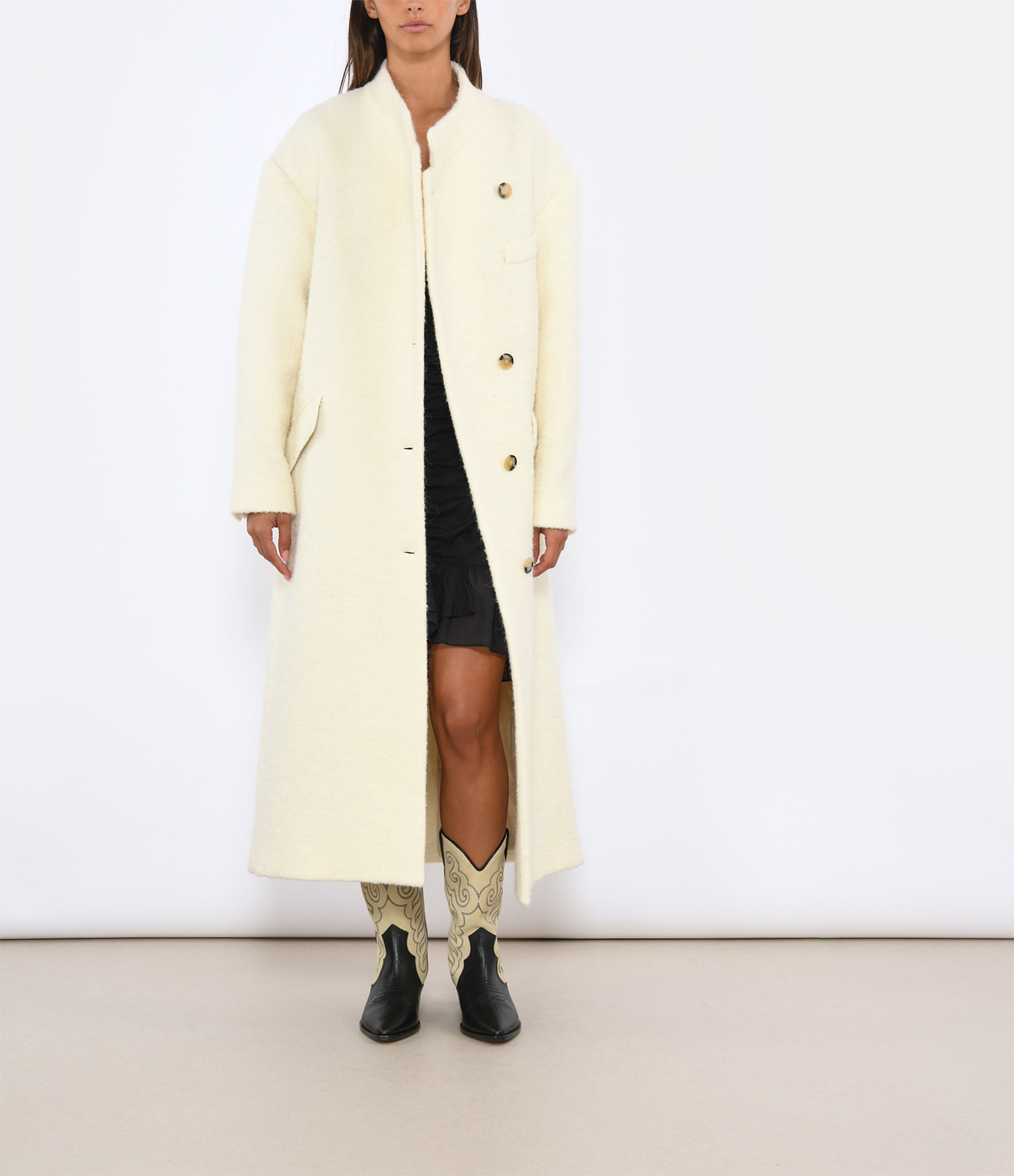 Manteau long en laine écru. Col rond boutonné à l'avant. Poches latérales. Manches longues boutonnées. Coupe droite large. Base droite fendue dans le dos.