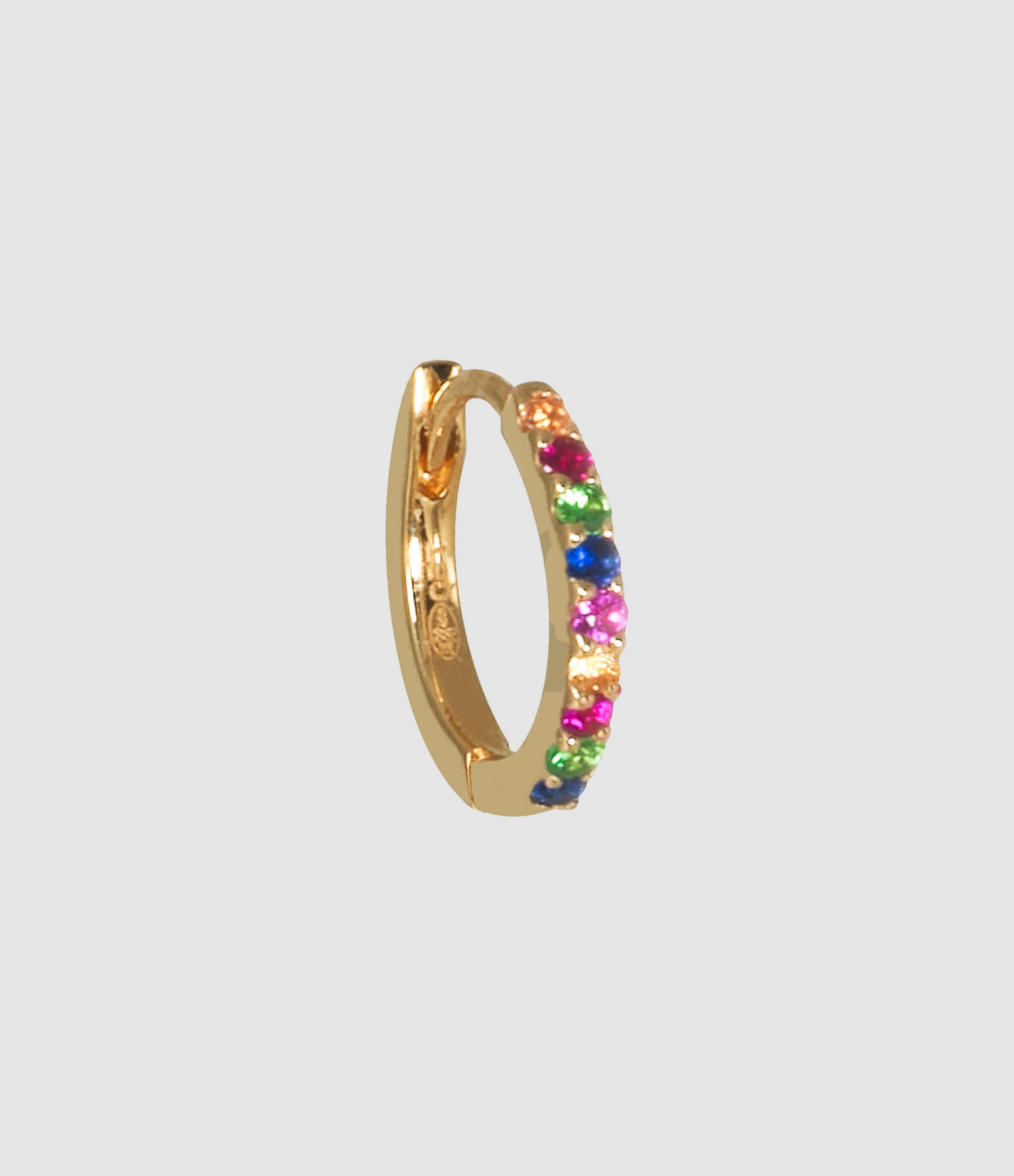 Mini créole en or jaune sertie de saphirs multicolores. Fermoir cliquet.