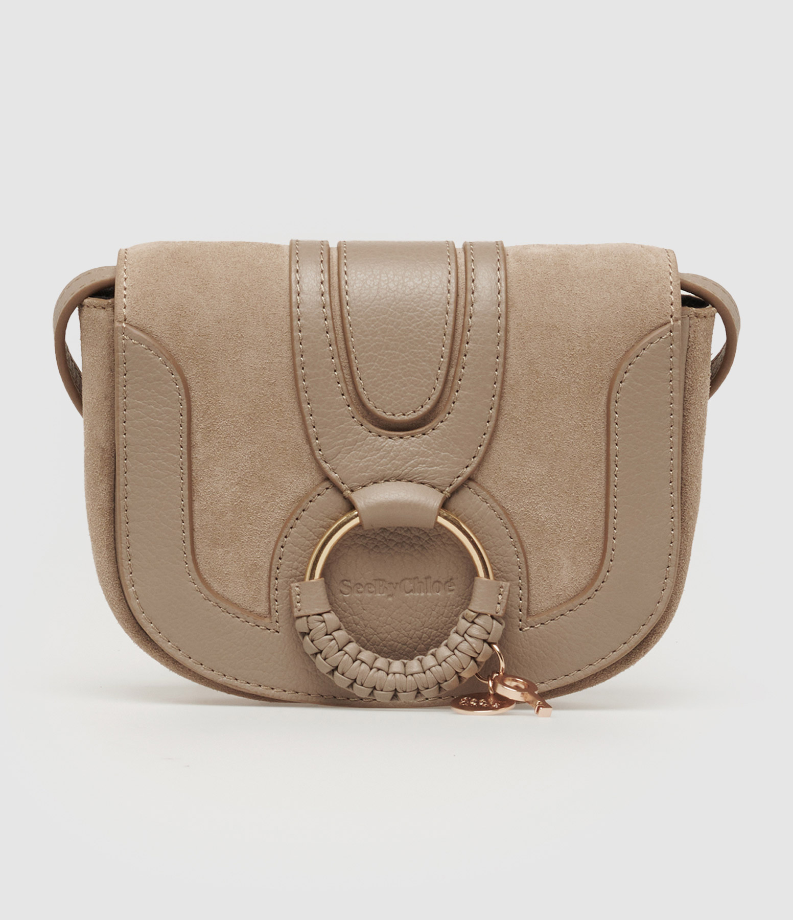 Petit sac en cuir grainé et cuir suédé gris. Fermeture par rabat aimanté orné d'un anneau en laiton plaqué or décoré d'une tresse en cuir avec une petite clé et une pampille estampillée See By Chloé. Une bandoulière réglable. Intérieur doublé en toile de coton organisé en un compartiment avec une poche plaquée.