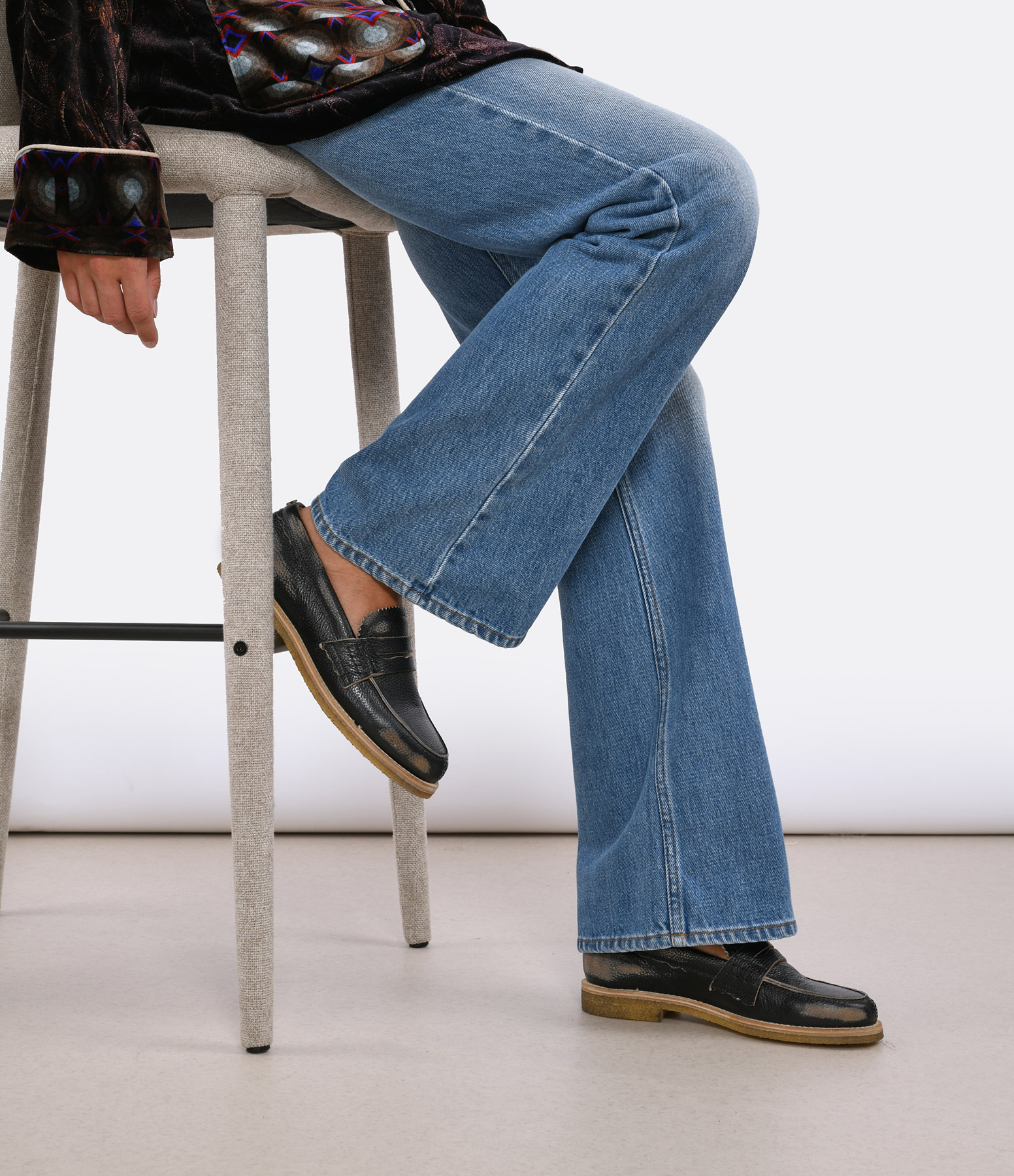 Mocassins en cuir grainé noir. Semelles en gomme. Talons blocs. Effets usés et tachés par endroits. Le soin apporté aux détails rend unique chaque modèle.