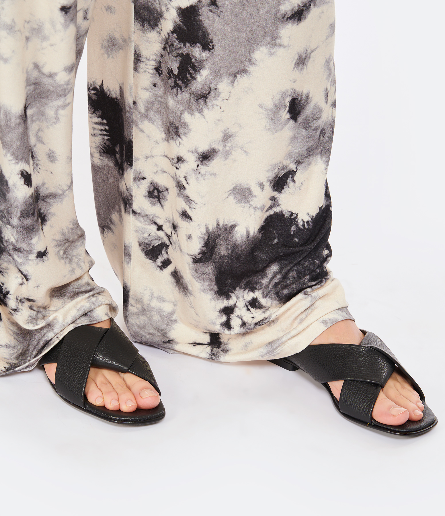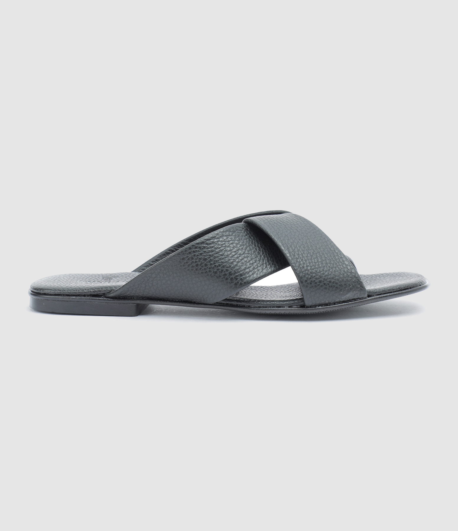 Sandales plates en cuir noir. Deux bandes croisées sur le devant.
