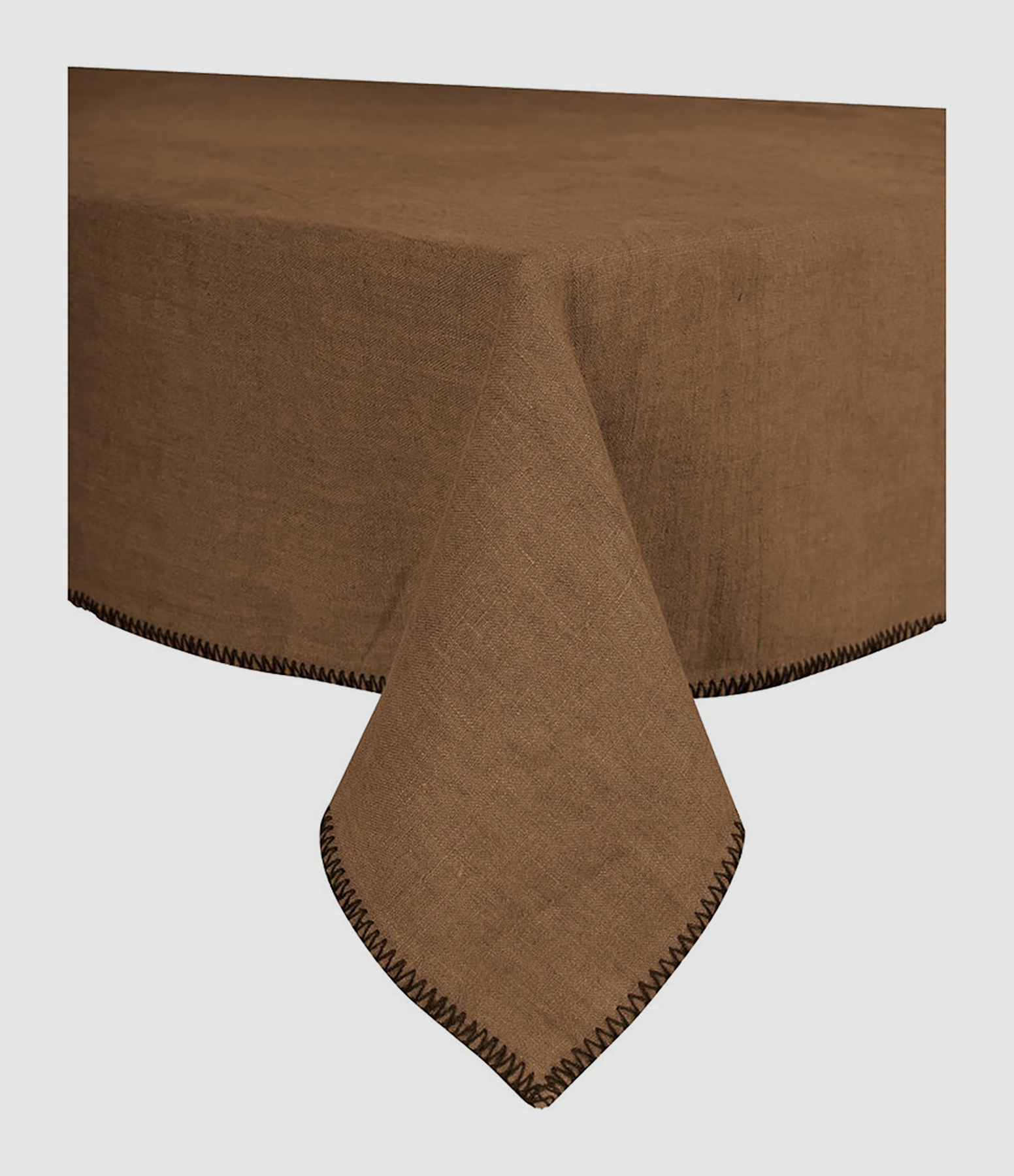 Nappe en lin lavé marron, avec finitions en crochet noir.