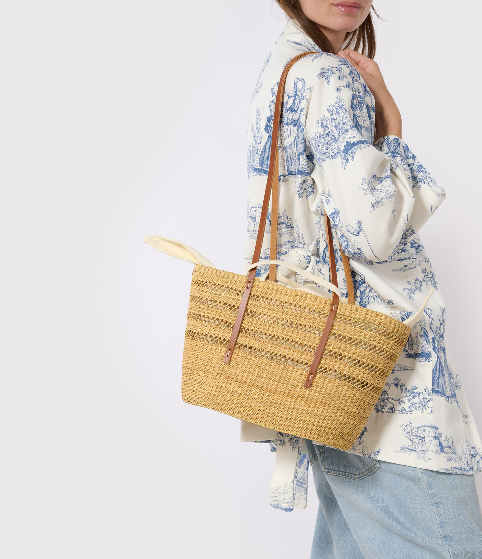 Sac en paille avec poche amovible écrue. Anses en cuir marron.