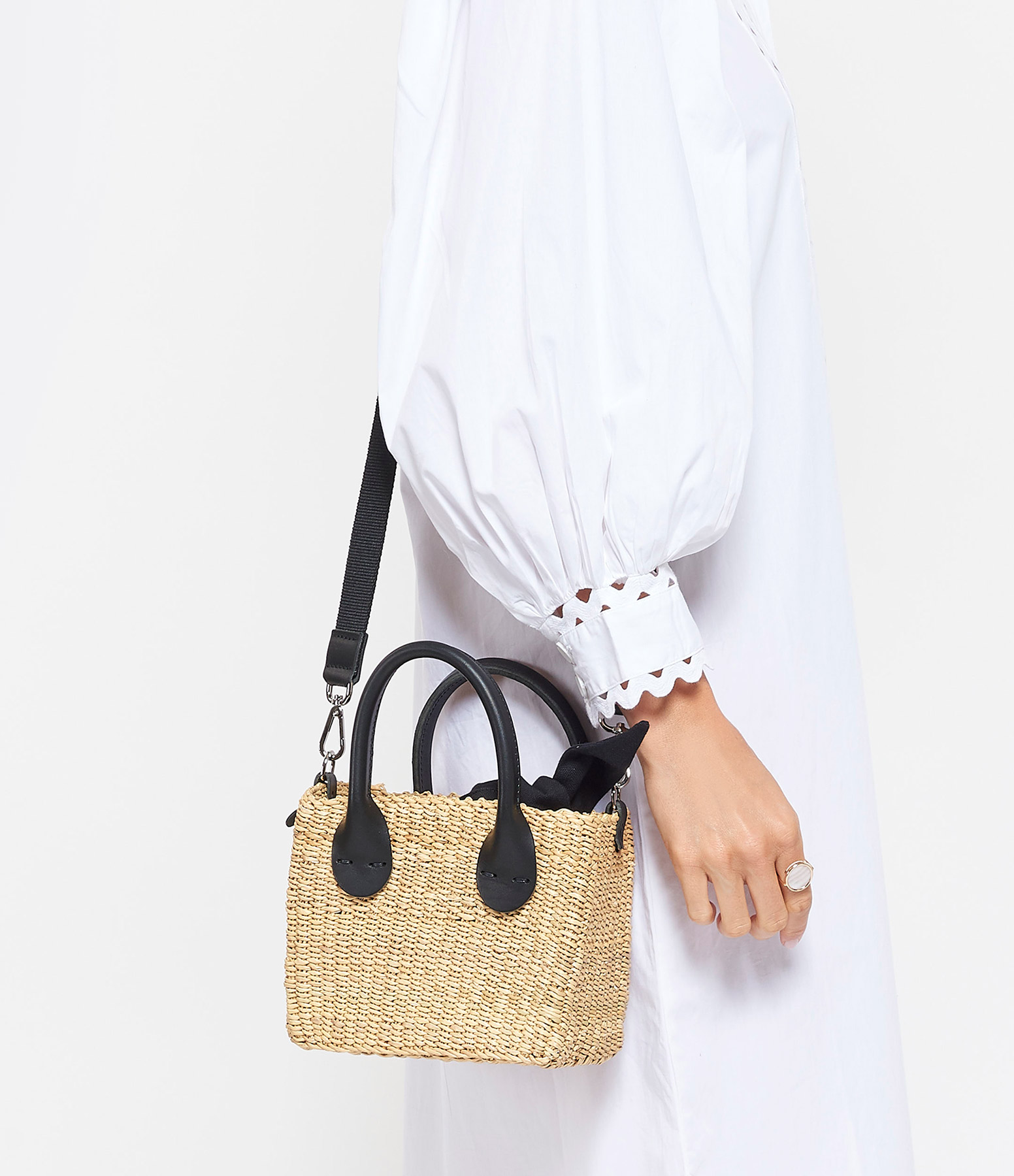 Petit panier rectangulaire en paille. Deux anses et une bandoulière en cuir noir. Doublé d'un pochon en coton amovible. Base plate.