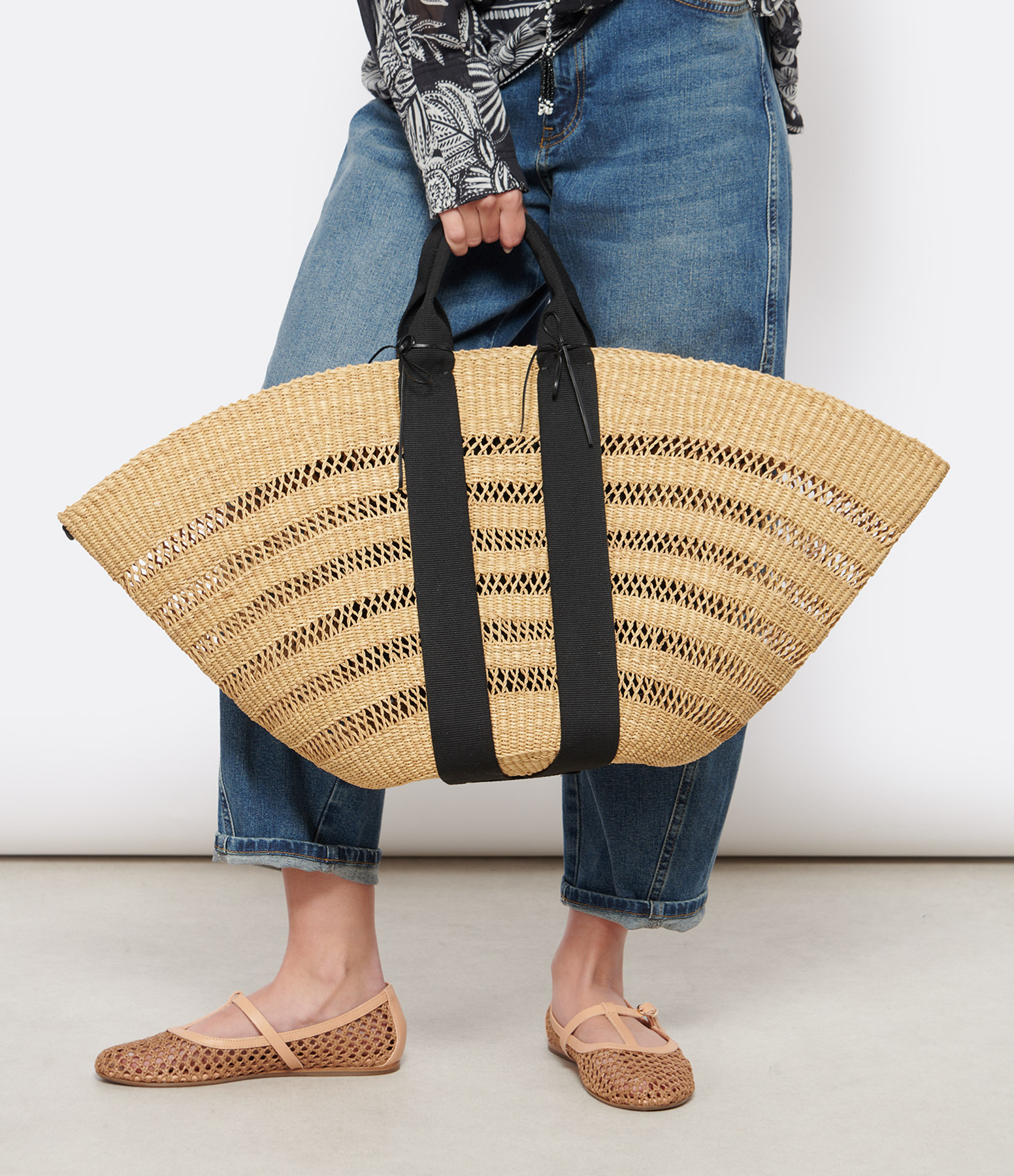 Sac en paille avec poche noire amovible. Porté main et épaule. Anses noires.