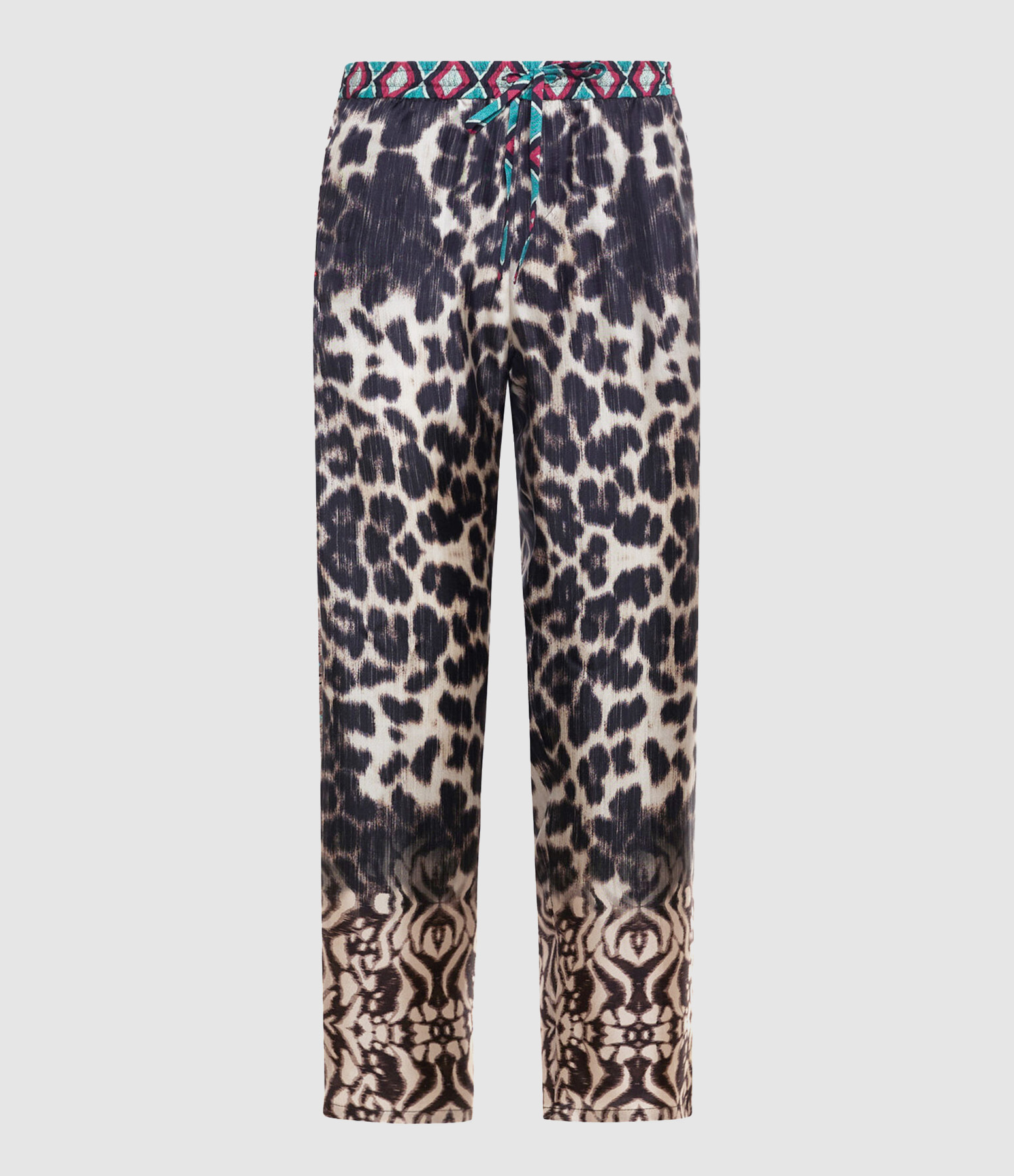 Le pantalon Aloe séduit par son imprimé léopard noir et beige et sa coupe droite élégante. La taille possède un lien de resserrage.