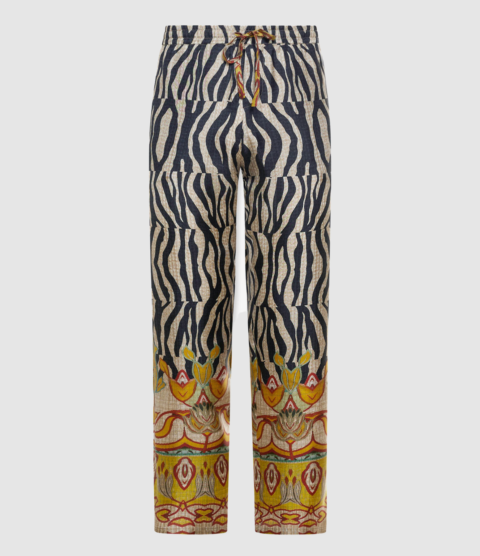 Le pantalon Aloe en beige se distingue par son motif zébré et floral. Il présente une coupe droite confortable et une ceinture élastique.