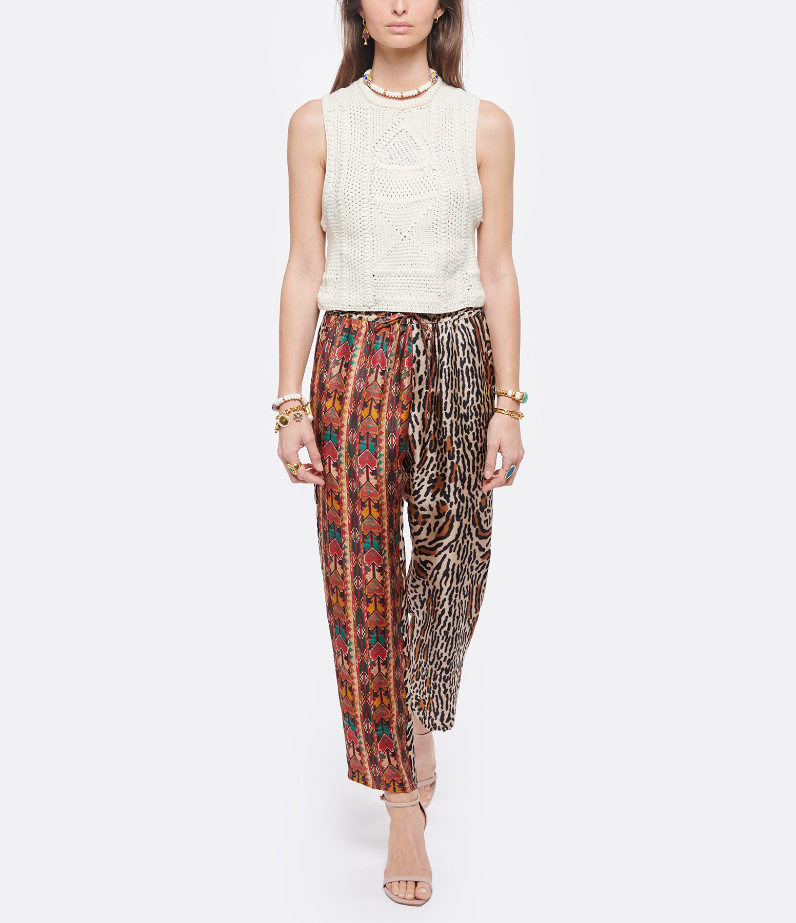 Pantalon en soie imprimée léopard et motif effet tapisserie. Taille élastiquée avec liens de serrage. Poches latérales. Coupe droite et ample.