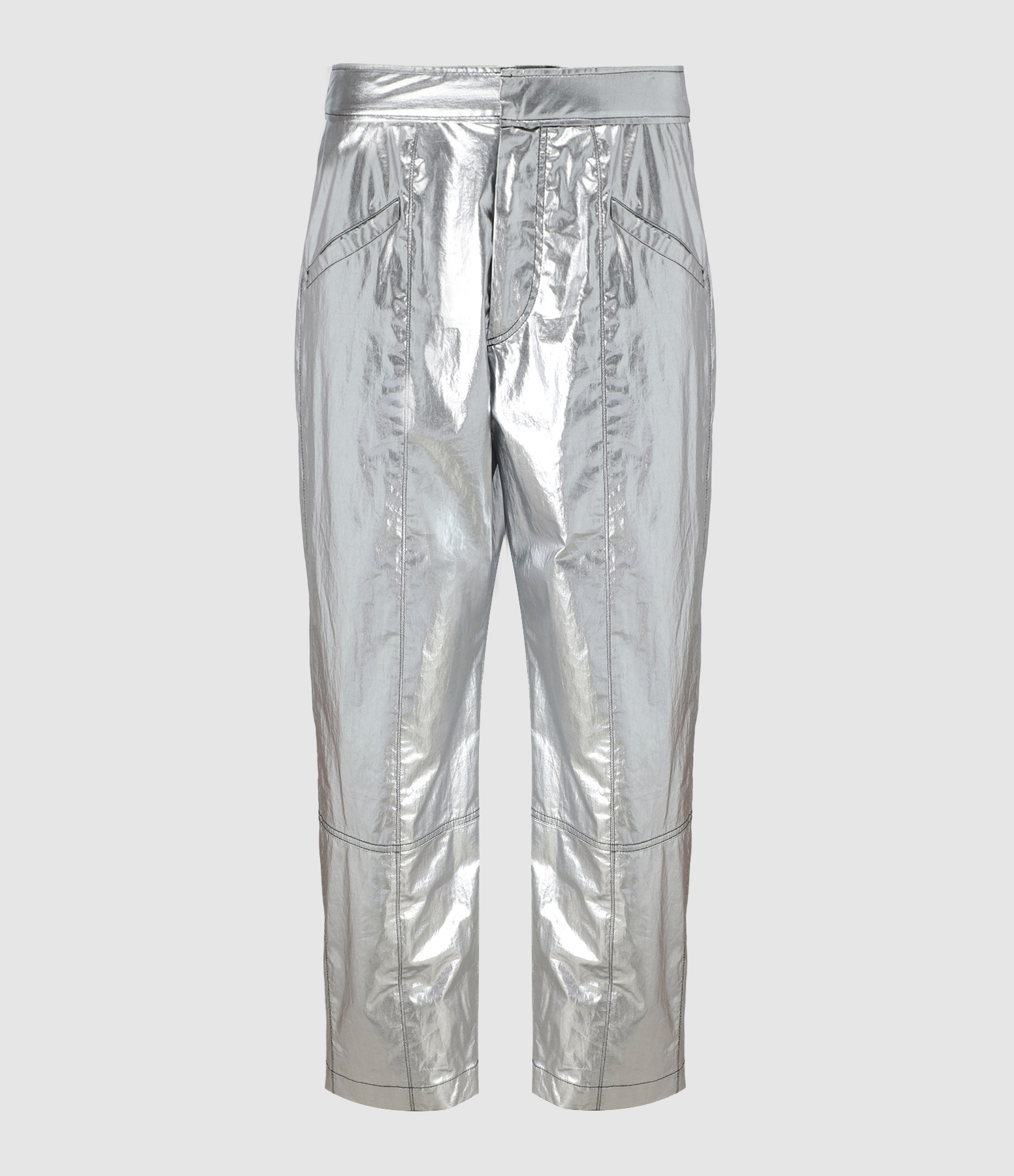 Pantalon droit argenté. Surpiqures noires. Deux poches à raglan à l'avant et deux poches plaquées dans le dos. Fermeture par zip et boutons invisibles. Coupe droite. Base droite.