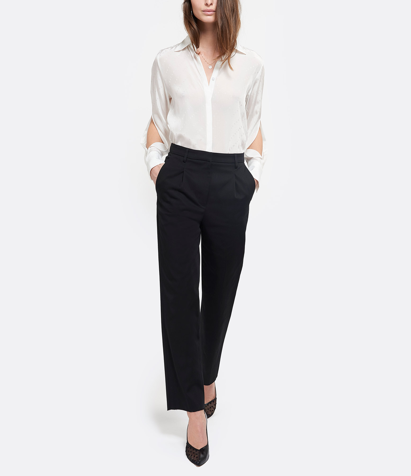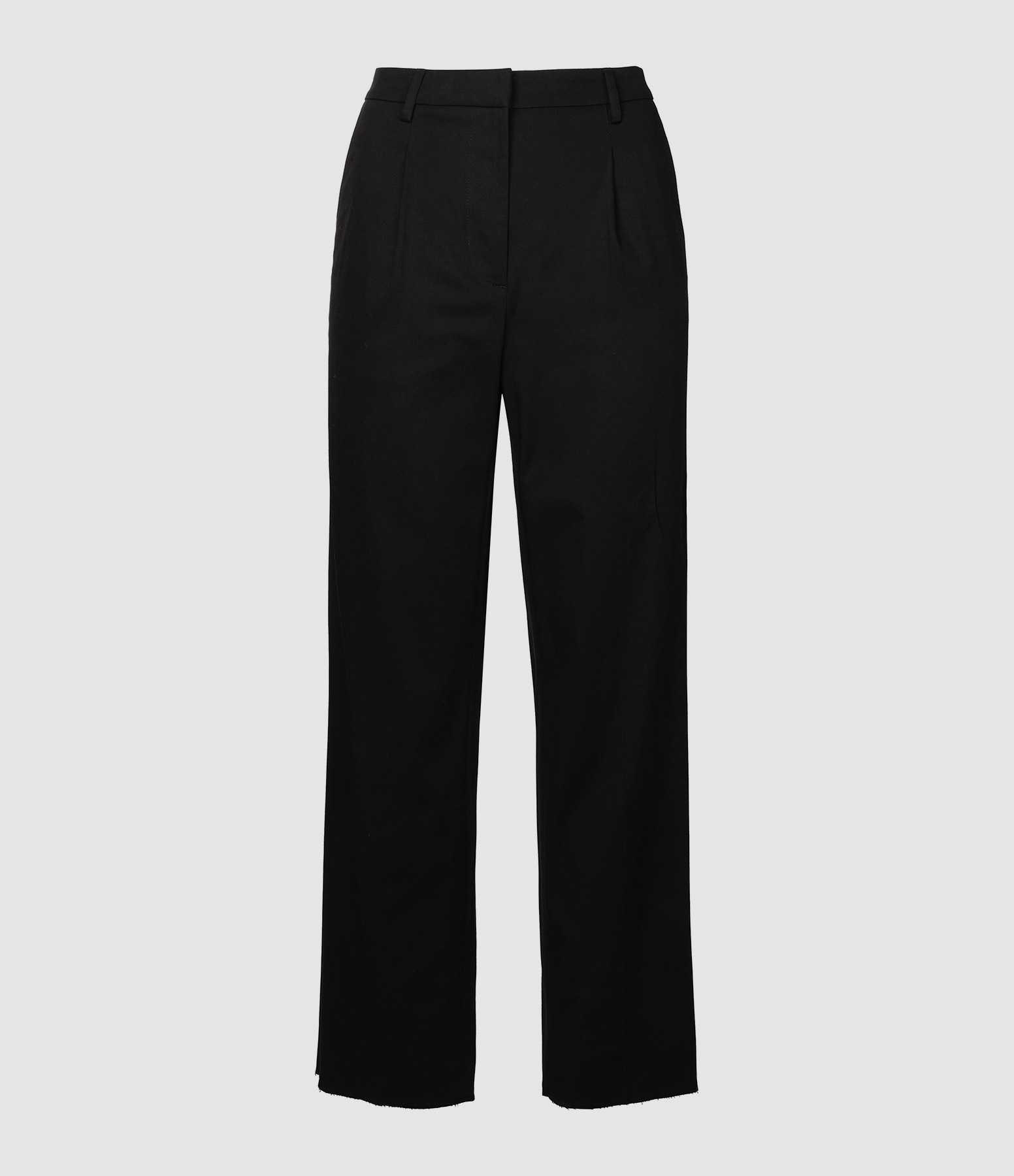Pantalon droit en coton noir. Bas de jambe effiloché coupé à cru. Deux poches italiennes à l'avant, une poche plaquée boutonnée et une poche passepoilée à l'arrière. Fermeture par zip.